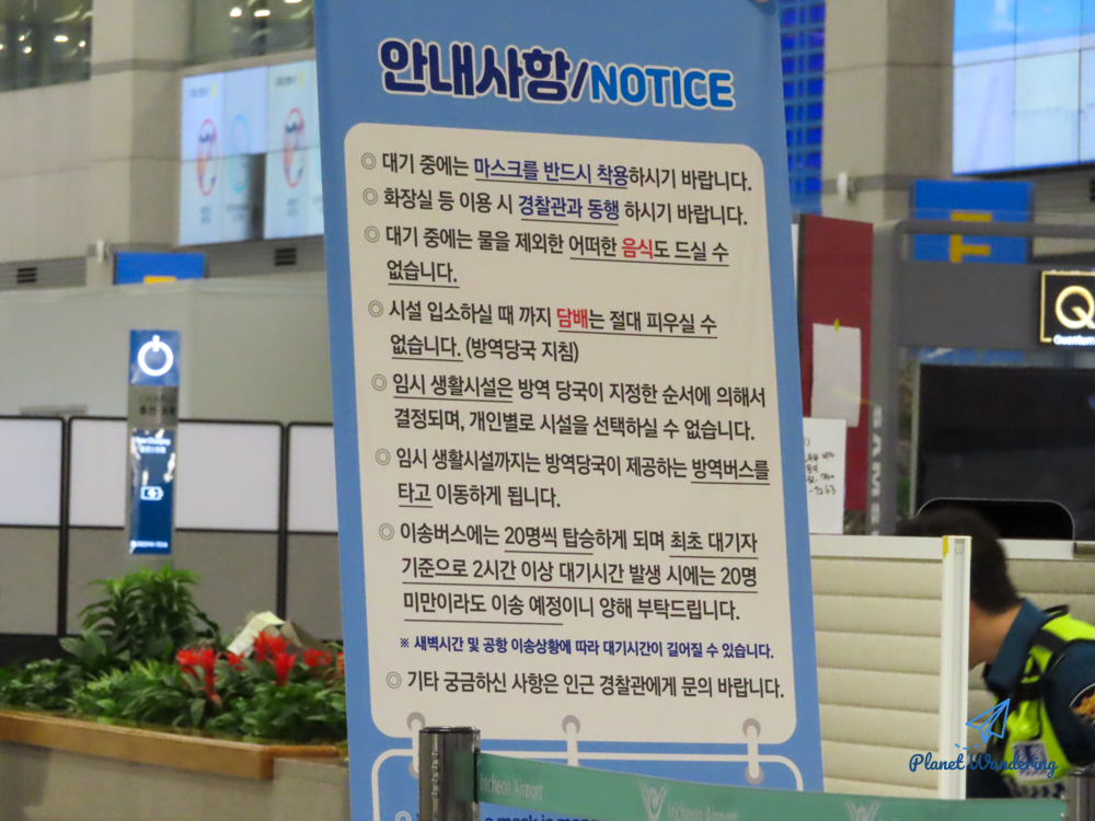 분류체계가 잘 갖춰져 있어서 노란색 목걸이와 검은색 목걸이를 한 사람들, 빨간색 목걸이를 한 사람들의 대기공간이 분리되어 있었습니다. 그리고 여기서부터 숙소까지의 인솔은 경찰관이 직접 담당을 합니다. 말 안 들으면 가만두지 않겠다는 의미겠죠? 격리 숙소에도 늘 경찰관이 상주합니다.
