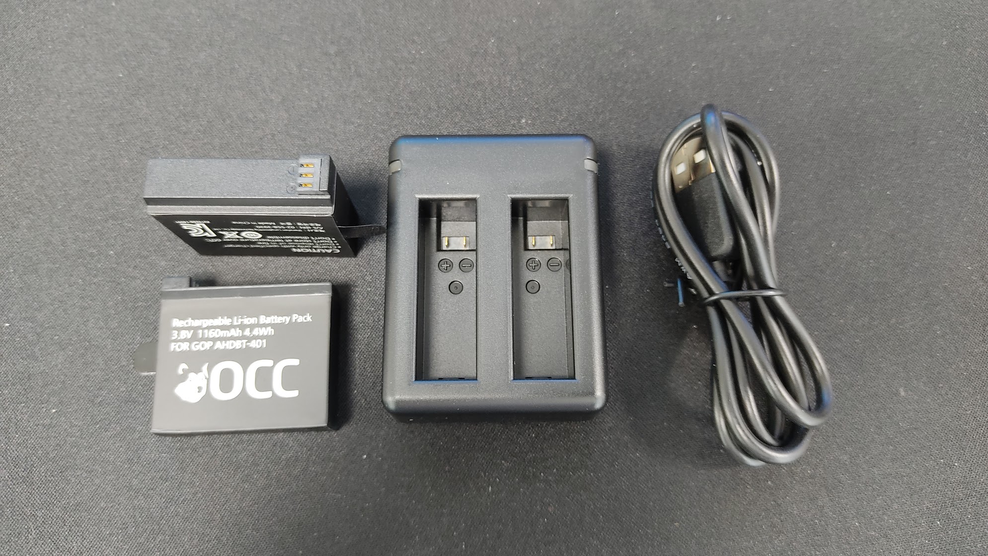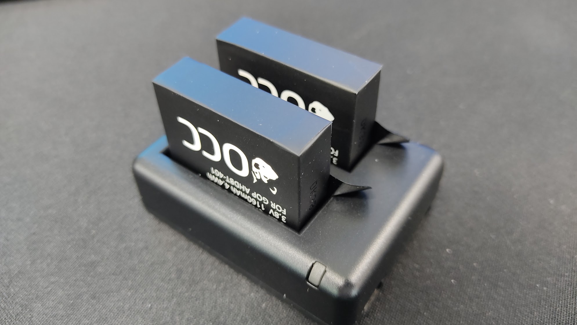 OCC 호환배터리를 충전기에 꽂아보았습니다. 깔끔한 때깔의 배터리 2개가 충전기에 딱 맞게 장착되었습니다. 배터리를 액션캠에서 쉽게 뽑아낼 수 있는 손잡이 태그도 견고하게 잘 달려있습니다.