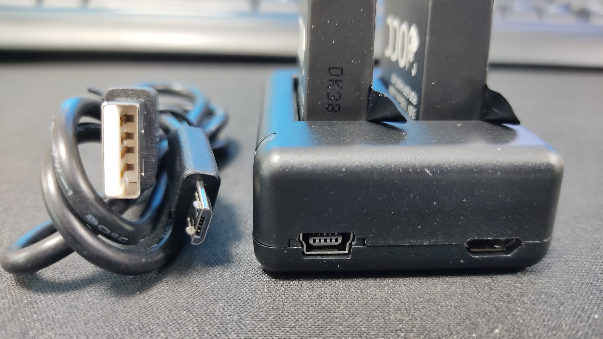 충전기를 살펴보면 특이한 점이 또 있습니다. 충전이 가능한 단자가 마이크로 5핀과 고프로에서 사용하는 미니 5핀 단자가 모두 달려있습니다. 2종류 케이블을 모두 사용할 수 있기 때문에 케이블을 하나 깜빡하고 촬영을 나갔더라도 해결할 방법이 있어 좋네요.