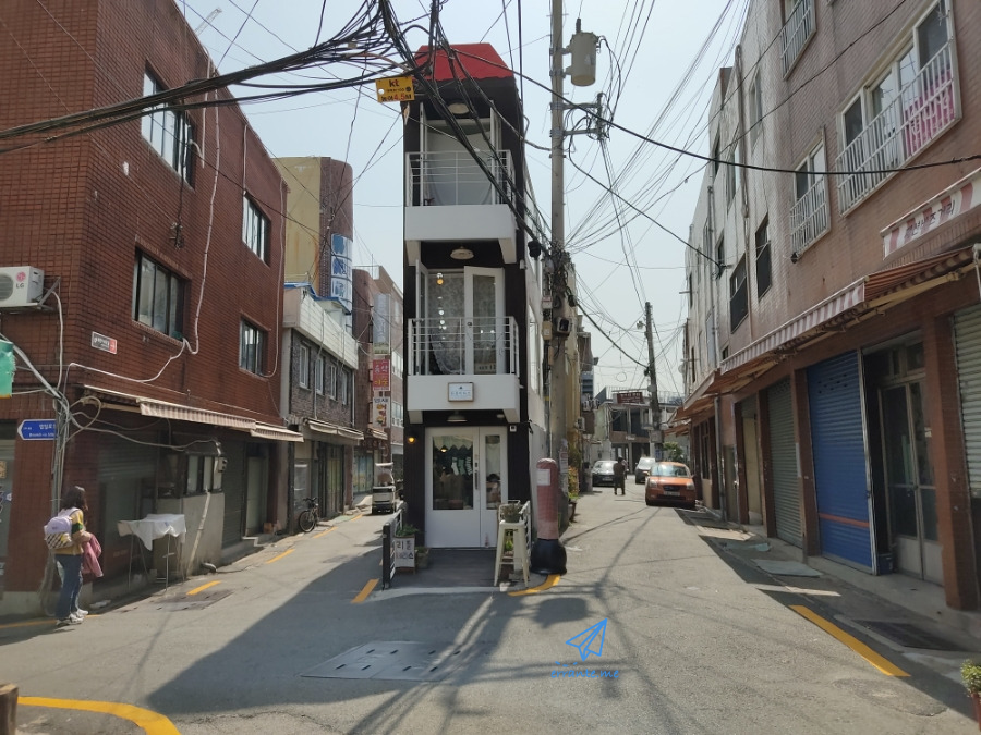 유심히 살피면 흥미로운 장면들이 많이 숨어 있습니다. 멀리서 보면 도로 위를 달리는 전차로 착각할 이 건물도 도로 한가운데 가늘고 길게 들어서있습니다. 예쁜 카페가 영업 중인데 어떤 사연으로 이런 모양새의 건물이 들어섰을지 궁금해집니다.