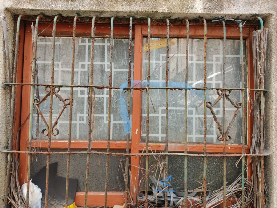 나무 창틀과 옛날 문양이 새겨진 유리창, 쇠를 구부려 만든 방범창이 오래된 세월을 이야기해 주는 것 같습니다. 이 2층 건물은 주변 집들에 비해 유난히 툭 튀어 올라온 느낌이고 창문도 커 보입니다.