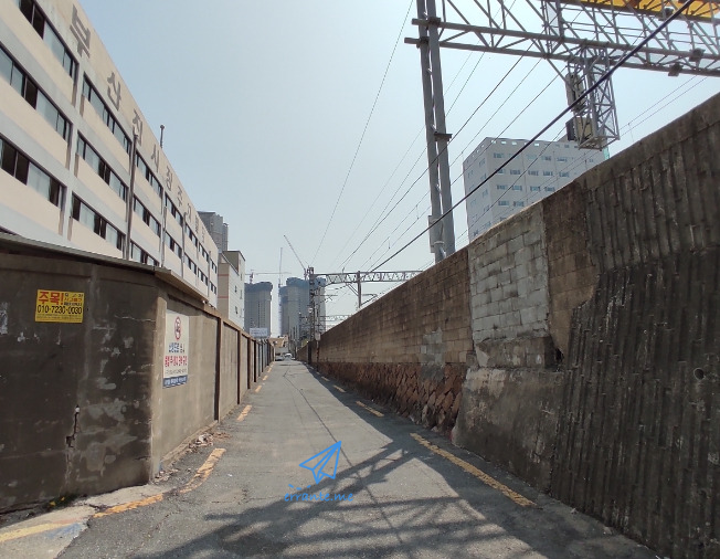 육교를 오르면 경부선 철도가 한눈에 들어옵니다. 이제는 기차가 대부분 전동화되어 철길을 따라 늘어선 전선도 자연스러운 풍경이 되었습니다. 1900년대 초기에도 진시장 주변 철길이 이렇게 넓었을까 궁금증이 생겼습니다. 주택과의 방음벽은 오래되지 않은 것 같은데, 예전 집들은 그대로 남아있으니까요. 주변의 집들은 각양각색이라는 표현이 잘 어울리는 것 같습니다. 오래된 집들의 모양새와 색깔이 모두 다르니까요.