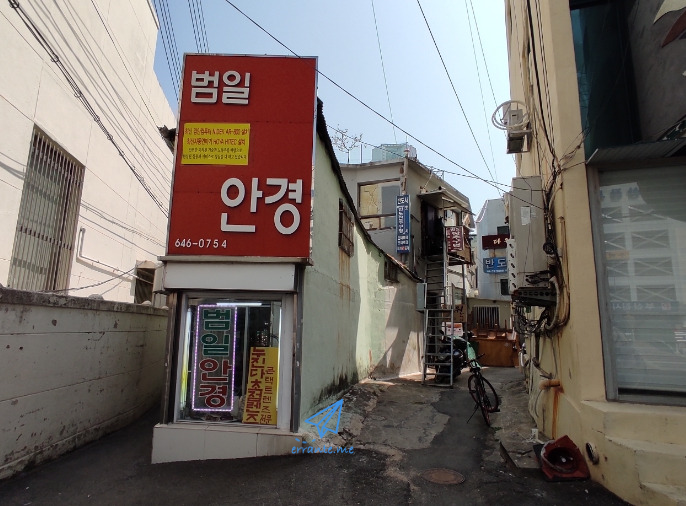 이 안경원 건물은 특이합니다. 어떻게 건물이 들어섰을까 궁금할 정도인데, 길 한가운데 좁고 긴 형태의 건물이 들어선 느낌입니다. 안경원 뒤쪽으로는 단추구멍 공장이 2층에 자리 잡고 있네요.