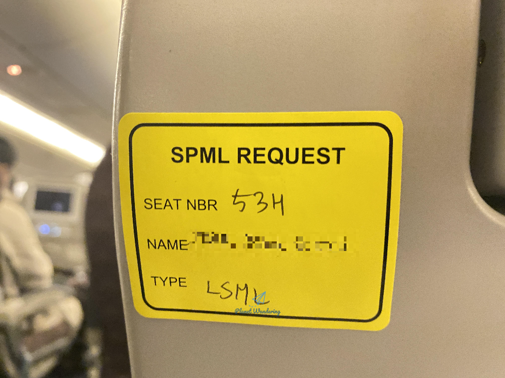 대한항공 저염식 메뉴를 살펴볼까요? 우선 다른 기내식과 달리 스티커가 붙어있습니다. SPML은 Special Meal 스페셜 밀의 약자입니다. 말 그대로 특별식이네요. 그리고 이름과 좌석이 적혀있고, LSML, Low Sodium Meal 저염식이라 표시되어 있네요.