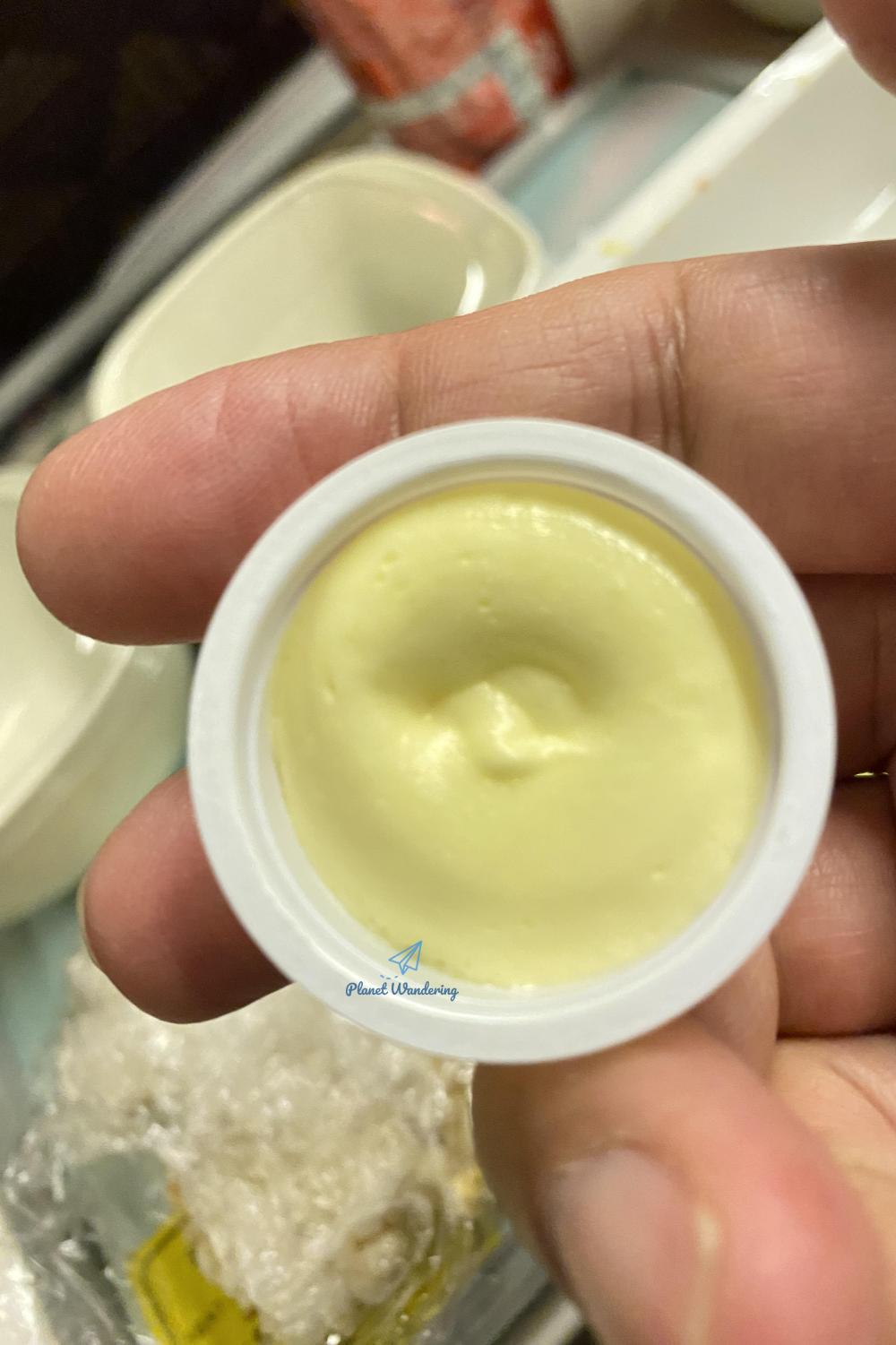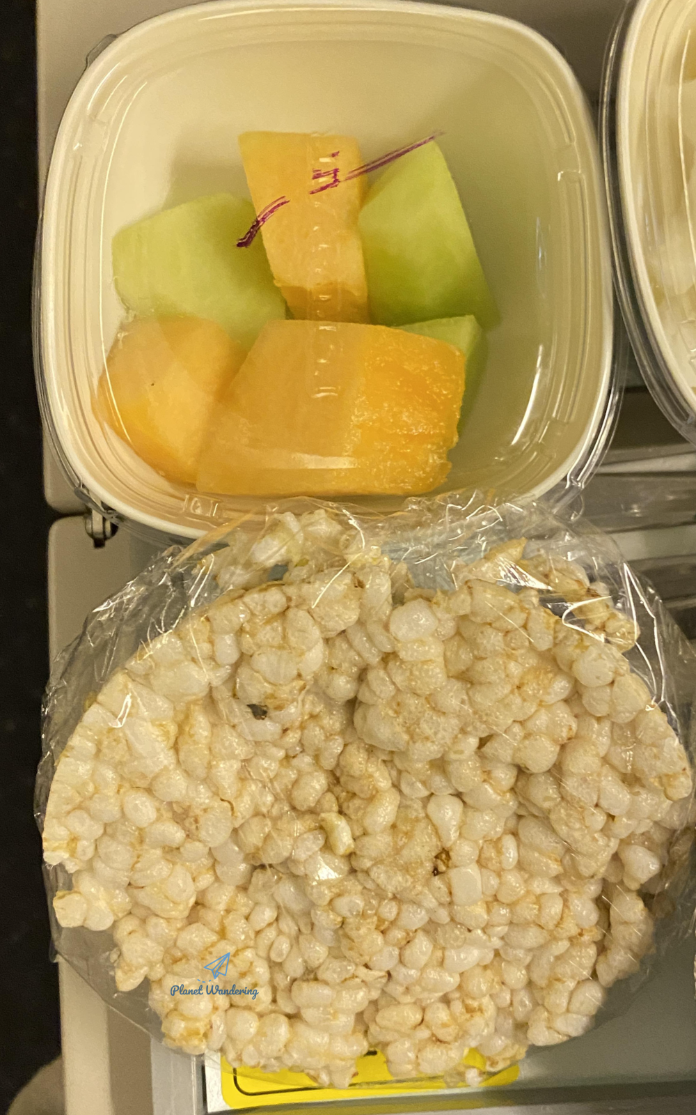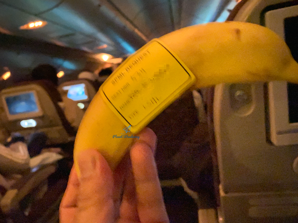 이 날 비행의 간식은 브리또였습니다. 종이에 말아 차곡차곡 쟁반에 담은 간식이 어두운 조명 아래에서는 김밥처럼 보이기도 했는데 승무원 말씀이 브리또라는군요. 자는 도중이라 잠에서 깨어있는 승객들만 겨우 하나 집어갈까 말까 였는데, 저염식을 신청했던 방랑객에게는 브리또 대신 바나나가 하나 왔습니다. 바나나에도 스페셜밀 스티커가 붙어있네요.