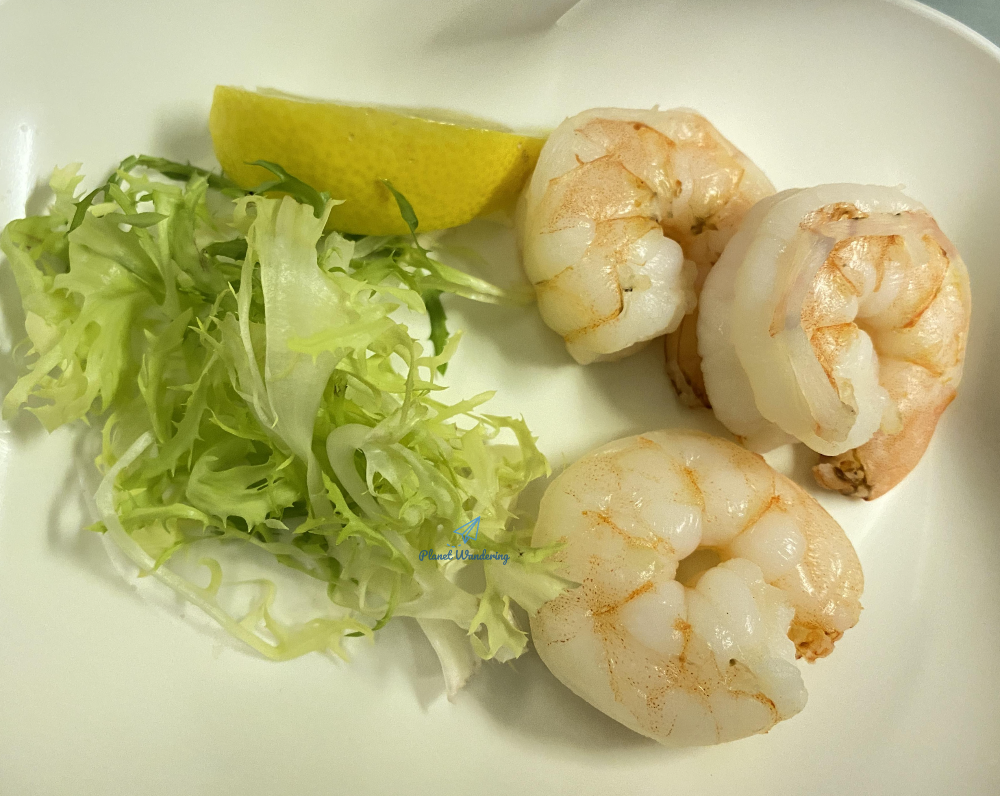애피타이저는 채소와 삶은 새우, 샐러드는 소스가 없는 모둠 풀입니다. 오이와 상추도 있고 방울토마토에 레몬도 한 조각 있네요. 디저트는 과일인데 딸기와 블루베리로 구성되어 있습니다. 초콜릿 무스 같은 단맛 듬뿍 디저트보다는 요런 과일 디저트가 더 몸에 좋아 보이긴 합니다.
