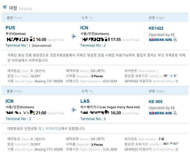 상담원은 10분 정도 후에 이메일로 이티켓이 올 거라고 안내를 해주었고, 잠시 후 이메일로 기존 항공권 일정에 내항기 일정이 추가된 항공권 이티켓이 도착했습니다. 이티켓을 보니 항공권 등급이 내항기, 국제선 모두 보너스 항공권을 뜻하는 X 등급이고 내항기 수하물 허용량도 국제선과 똑같은 23kg 2개로 되어 있습니다. 하나의 항공권으로 내항기, 국제선을 묶어야 하기 때문에 마일리지로 국제선 항공권을 구매했다면 내항기도 마일리지로 구매해야 한다는 규정이 이해가 되었습니다.