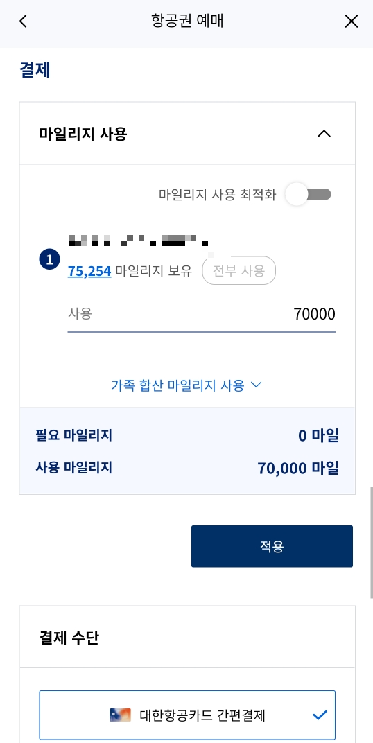 이제 모든 예약 절차가 끝나고 결제만을 남겨두고 있습니다. 방랑객과 가족회원으로 연결된 가족이 보유한 마일리지를 보여주면서 이걸 진짜 쓸 거냐고 묻는 것 같네요. 방랑객이 보유한 75,000마일리지 중 아낌없이 7만 마일을 털어 넣습니다. 마일리지가 2023년과 2024년에 대부분 사라지기 때문에 이 시기에 반드시 사용해야 해서 아쉬움도 없습니다.