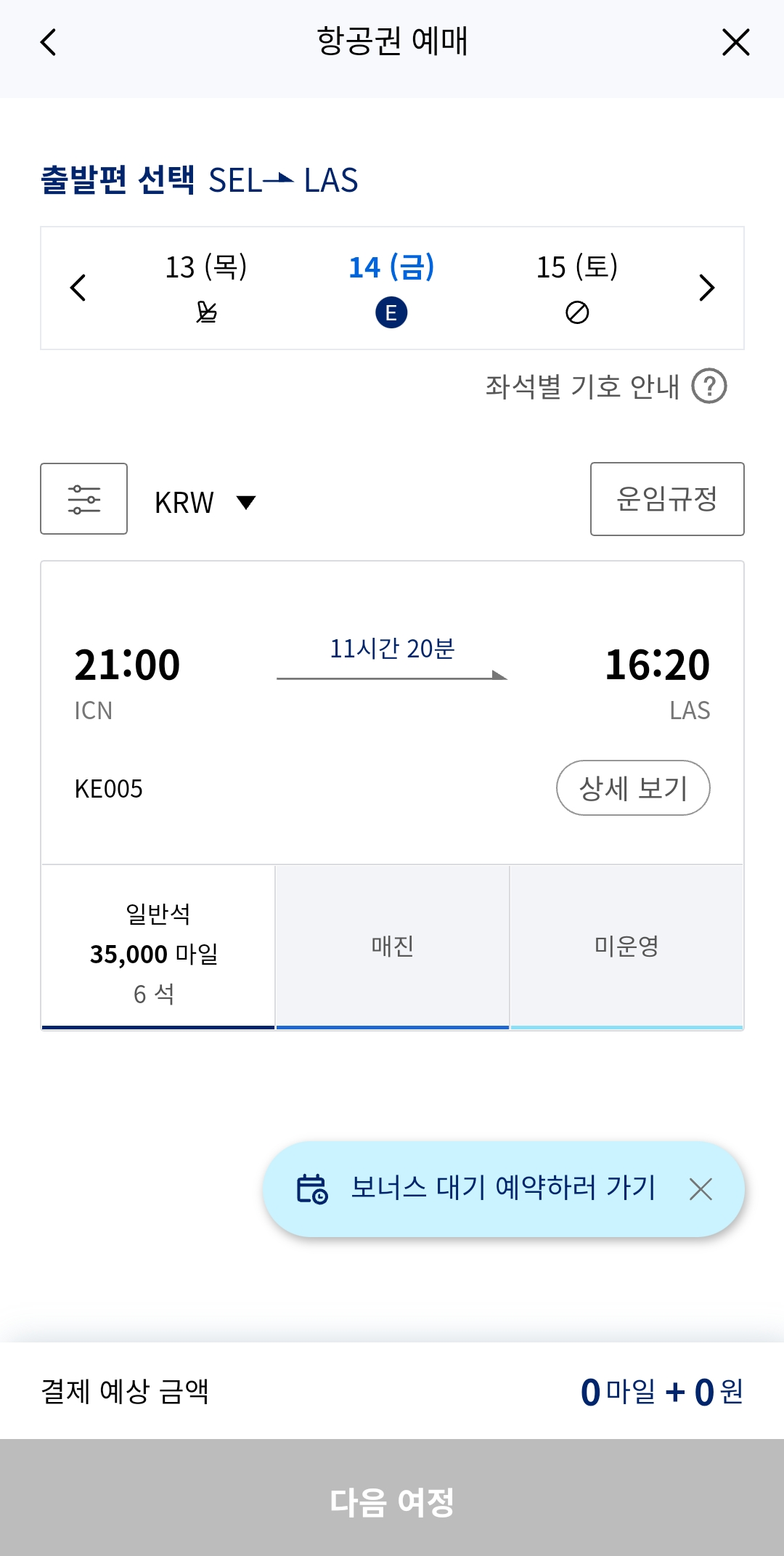 가족 마일리지를 좀 더해서 인천 라스베가스 프레스티지 항공권을 욕심내보기도 했지만,, 일반석 예약 후 몇 달 동안 단 한 번도 방랑객이 원하는 일정의 비즈니스석 마일리지 좌석이 열린 적이 없습니다. 돈을 받고 팔아도 수요가 충분한 구간이기 때문에 굳이 마일리지 손님에게까지 비즈니스 좌석을 열어줄 필요가 없는 거죠. 충분한 마일리지를 갖고 계시더라도, 인기 좋은 구간의 보너스 항공권이 비즈니스까지 쉽게 열리지 않는다는 걸 기억해 두실 필요가 있겠네요.