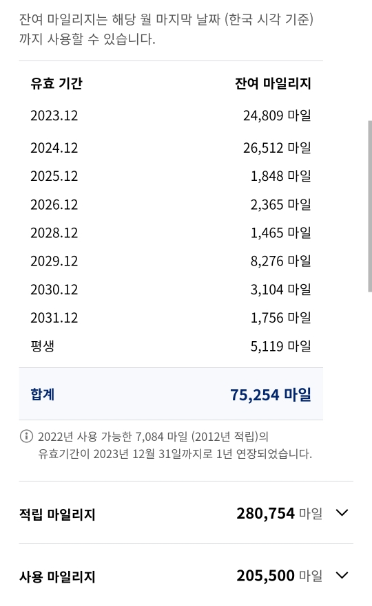 대한항공 앱을 열었습니다. 방랑객은 평생동안 28만 마일을 적립하고 그중 20만 마일을 사용해서, 이제 7만 5천 마일이 남아있습니다. 문제는 7만 5천 마일의 상당 부분인 5만 마일이 2023년 말, 2024년 말에 사라진다는 점이죠. 이나마도 코로나 사태로 인해 비행기 여행길이 막히면서 대한항공이 일부 마일리지의 유효기간을 1년 연장해 준 것이 도움이 되었습니다.