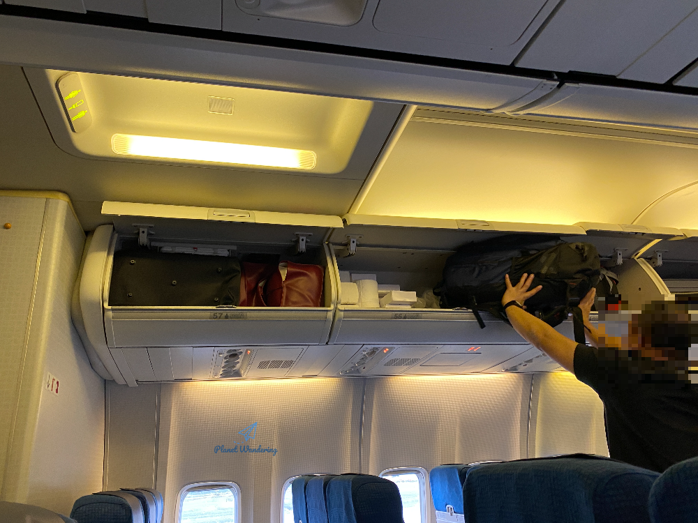 비행기에 올랐습니다. 기종은 보잉 737-900. 한 눈에 봐도 좀 오래된 비행기입니다. 시트나 기내 디자인이 제법 된 느낌이네요. 오늘도 역시 만석입니다. 특히나 외국인 탑승객들은 짐이 많아서 머리 위 선반이 가득 차고도 공간이 부족할 정도였습니다. 머리 위 선반을 '선점'하기 위해서는 가능한 일찍 비행기에 오르는 게 좋습니다. 가지고 타는 짐이 많다면 조금 번거롭더라도 대기줄에 일찍 들어가 서는 게 좋죠. 대충 눈대중으로 내 좌석 근처 선반에 짐이 많거나 비행물품이 들어있다면, 내 자리까지 가기 전 선반에 내 짐을 얹어버리는 게 좋습니다. 내 자리 근처에 빈 공간을 찾으며 우왕좌왕하다가는 정말 짐 올릴 공간이 부족해 진땀을 흘릴 수도 있죠. 머리 위 선반은 주인이 따로 있는 게 아니라 그냥 아무 데나 얹고 들어가도 괜찮습니다.