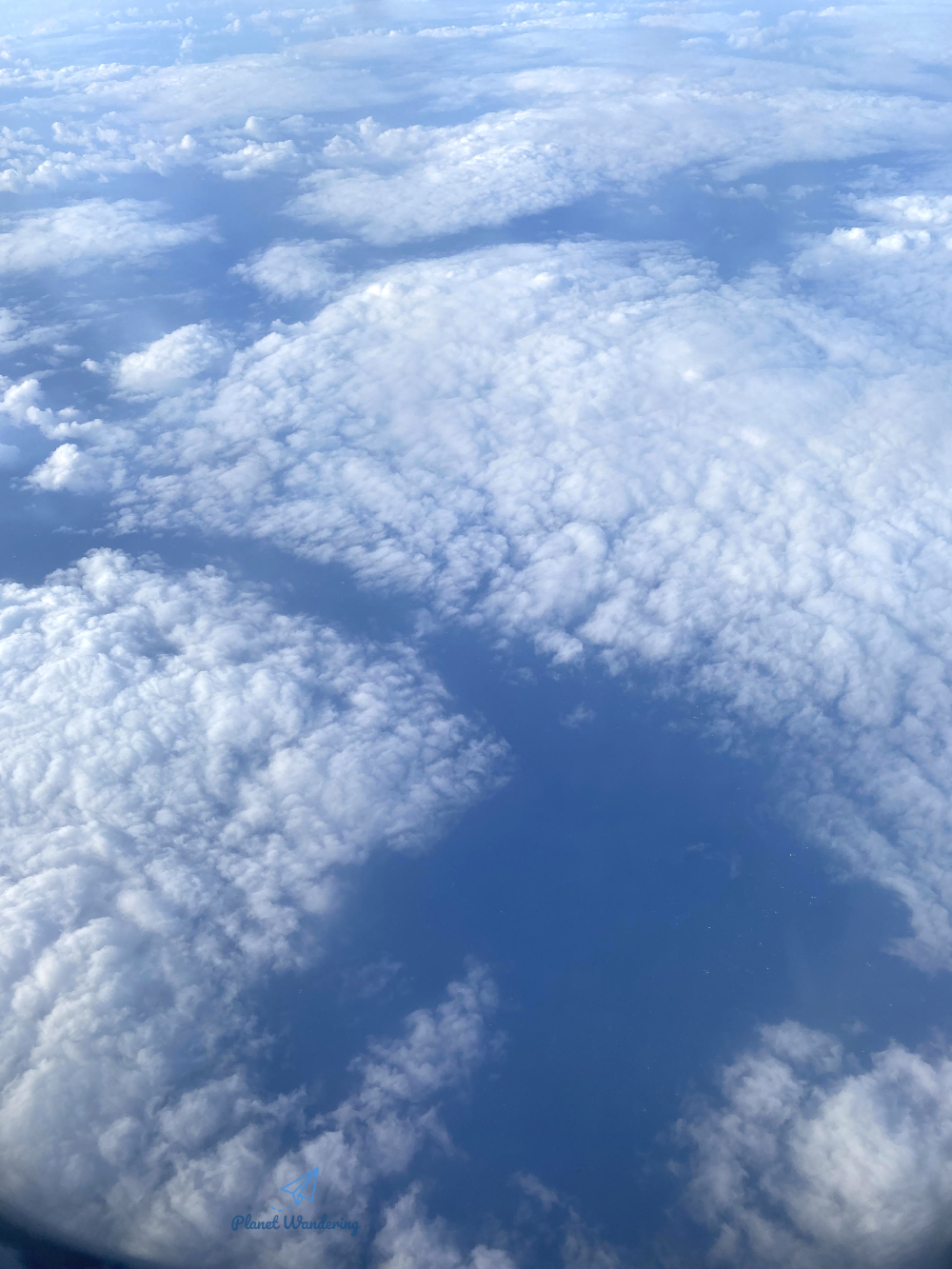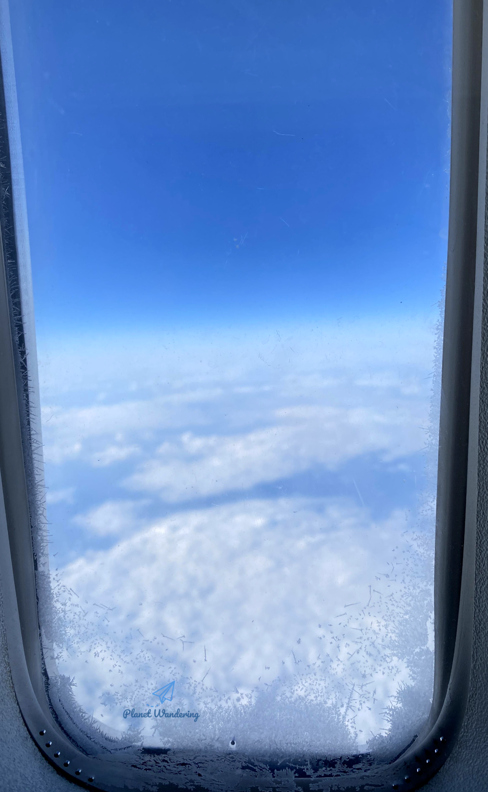 화장실을 들락거리며 화장실 옆 비상구의 쪽창문을 열어보니 대낮입니다. 구름이 제법 끼어있고 그 밑으로 시퍼런 태평양 바다가 내려다보이네요. 화장실 옆 쪽창문은 너무 오래 열고 있으면 뒷자리 승객들에게 밝은 빛이 그대로 전해져 휴식에 방해가 되죠. 얼른 사진만 찍고 창문 가리개를 닫았습니다.