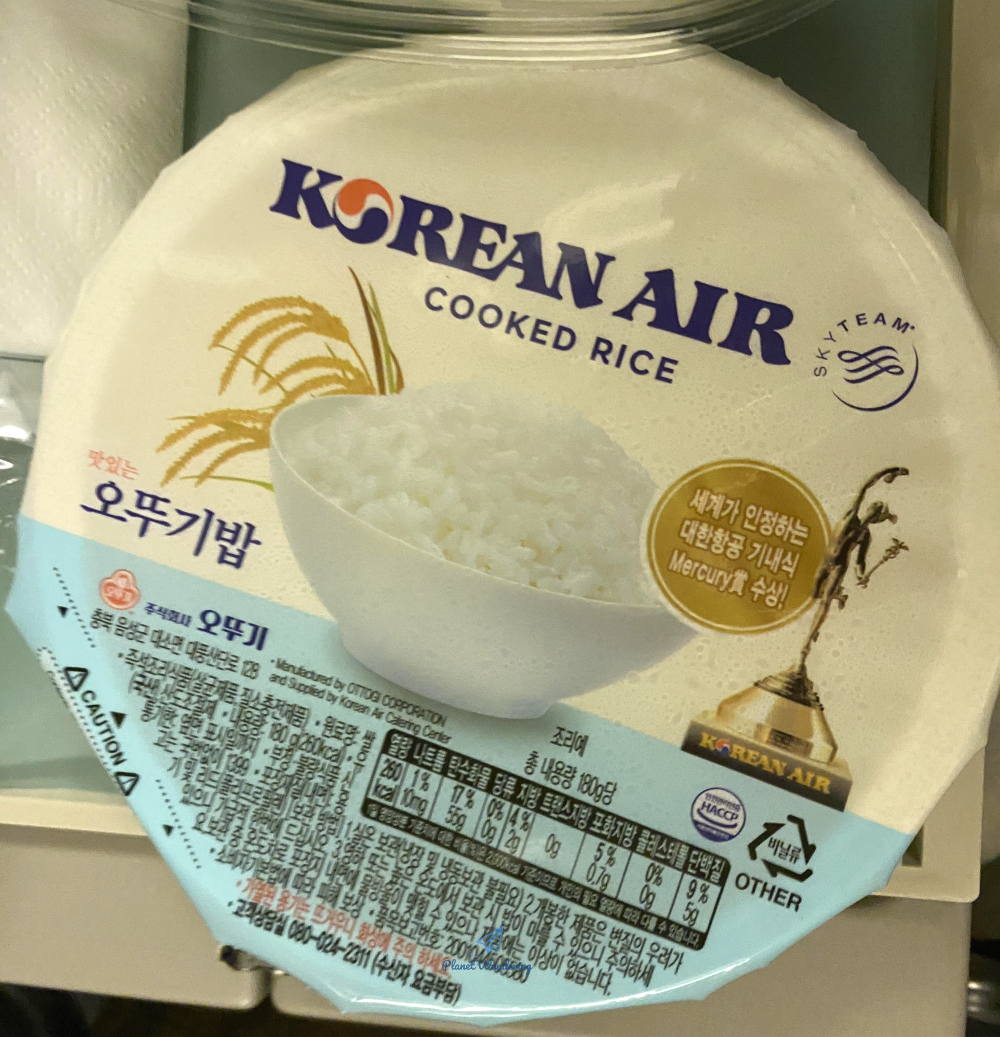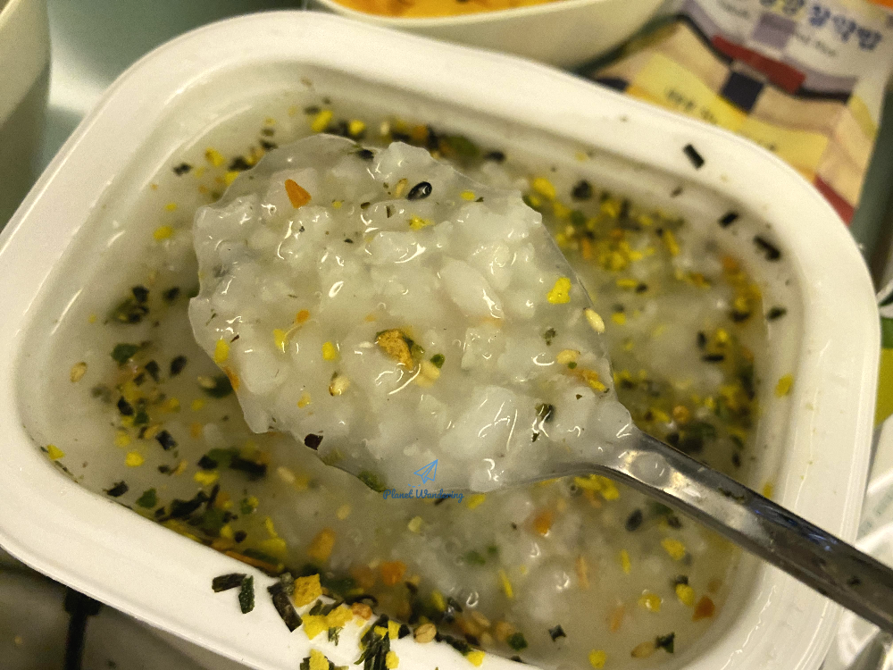 모든 조명이 켜지고 아침이 되었습니다. 실제로 라스베이거스는 오후 시간대지만 말이죠. 이제 아침밥을 나눠줍니다. 아침식사는 오믈렛과 죽 2가지였던 것 같은데 족을 선택했습니다. 흰쌀죽도 오뚜기 제품이군요. 아마 오뚜기와 대한항공이 밀접한 비즈니스 관계를 맺고 있는 모양이네요.