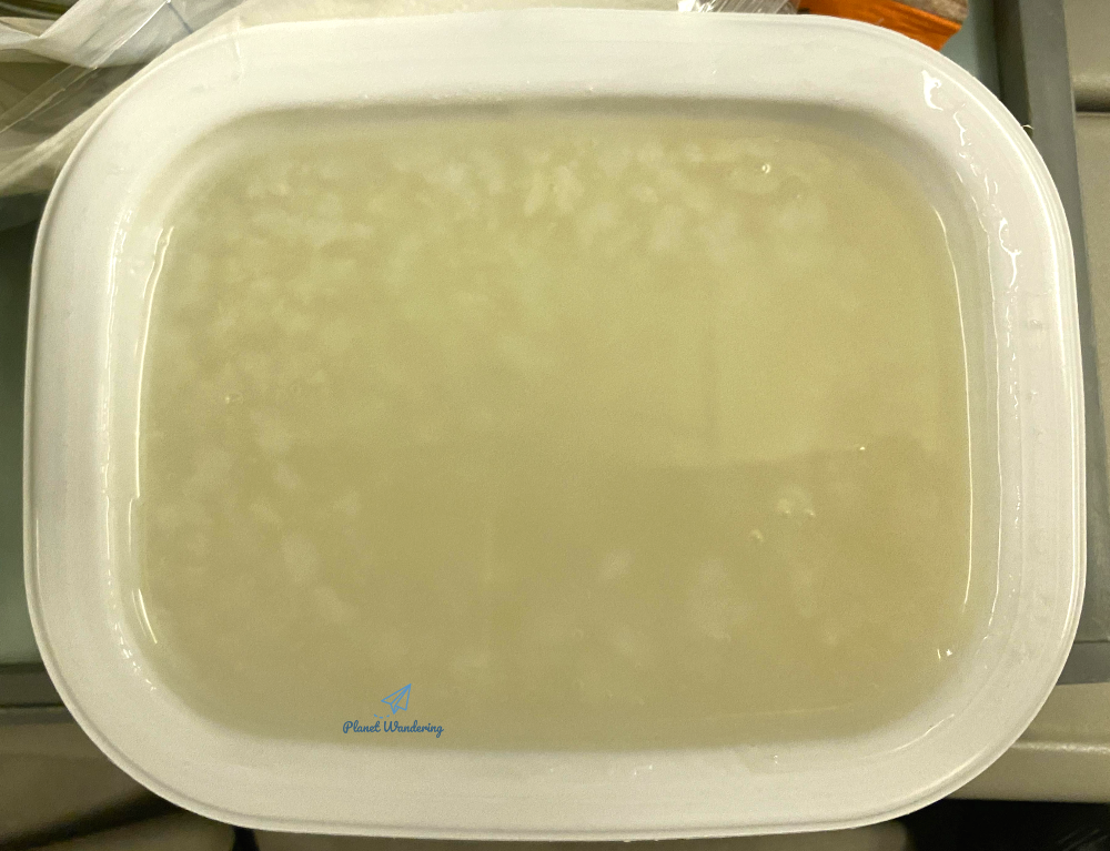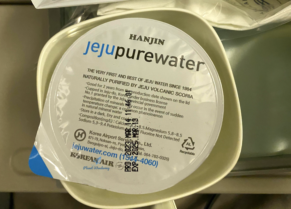 부추, 당근, 버섯, 볶은 고기 등등 집이나 땅 위 식당에서 먹는 비빔밥 이상으로 다채로운 구성물입니다. 하늘 위에서 먹는 한식 한 그릇의 매력 때문에 대한항공을 고집하는 분들이 많은 모양입니다. 햇반 종류인 오뚜기밥도 잘 익었고 마른 밥알 없이 촉촉해서 좋았습니다. 국은 스티로폼 그릇에 미역국 블럭이 들어있고 여기에 승무원들이 뜨거운 물을 부어주는 형태입니다. 이 날은 비행 내내 비행기가 끊임없이 흔들려서 따끈한 미역국은 맛도 음미하지 못하고 후루룩 먹어치워야 했죠.