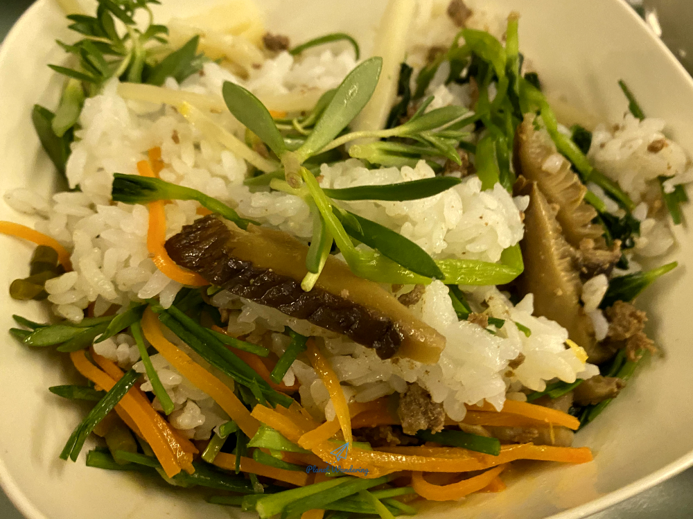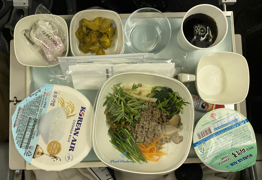 대한항공의 저녁식사 메뉴는 3가지 중 하나를 선택하는 겁니다. 보통 항공사들은 2가지 메뉴를 놓고 하나를 선택하게 하는데 기내식에 진심인 대한항공은 메뉴가 3가지나 되어 좋습니다. 뭘 먹을까 설명을 듣지도 않고 귀에 쏙 들어오는 비빔밥을 선택했습니다. 비빔밥은 즉석밥 종류인 오뚜기밥, 즉석국 종류는 오뚜기 미역국, 그리고 커다란 그릇에 정성스레 담겨있는 비빔밥 용 야채와 고기볶음으로 구성됩니다.