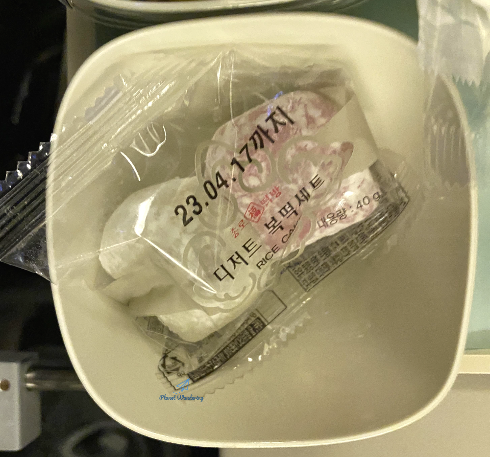 함께 나온 피클과 찹쌀떡입니다. 피클은 새콤새콤해서 비빔밥과 함께 먹기 좋았고 찹쌀떡까지는 먹을 수 없을 만큼 배가 불러 찹쌀떡은 잘 넣어두었다가 라스베가스 호텔방에서 간식으로 먹었습니다. 기내식에 따라 나오는 디저트류는 다 먹거나 버리지 말고 주머니나 가방에 넣어두었다가 여행지 숙소에서 까먹으면 나름 재미도 있고 간식 비용도 아낄 수 있죠.