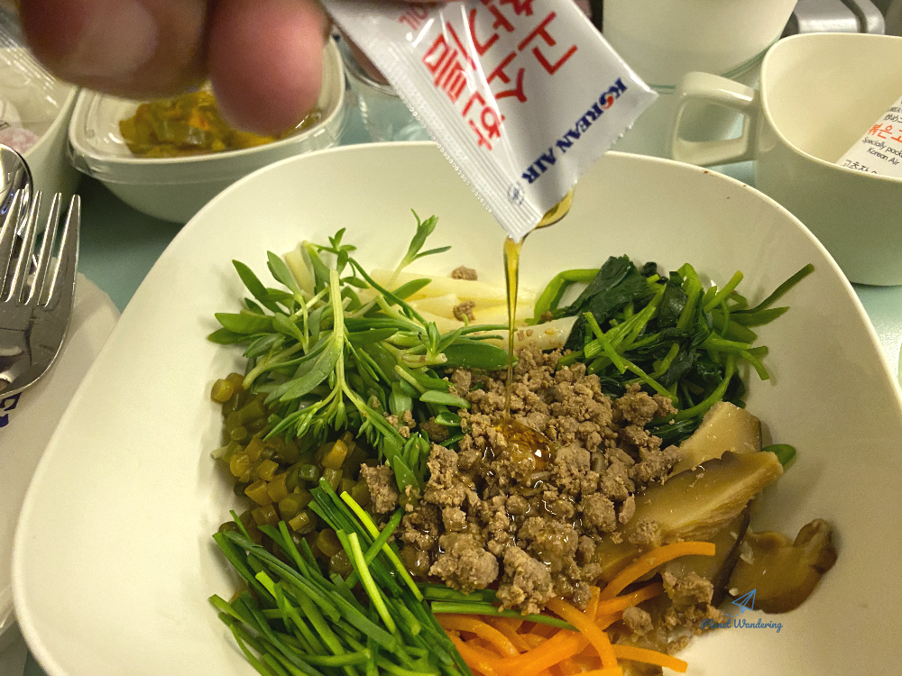 비빔밥 재료를 보고 있자니 군침이 돕니다. 저녁 8시 30분에 이륙을 했고 대략 2시간이 지났으니 밤 10시 30분 정도 되었습니다. 신용카드를 이리저리 굴려 마티나 라운지에서 이것저것 챙겨 먹었지만 탑승 기념 기내식도 알차게 먹어야겠죠. 우선 참기름을 골고루 뿌려줍니다.