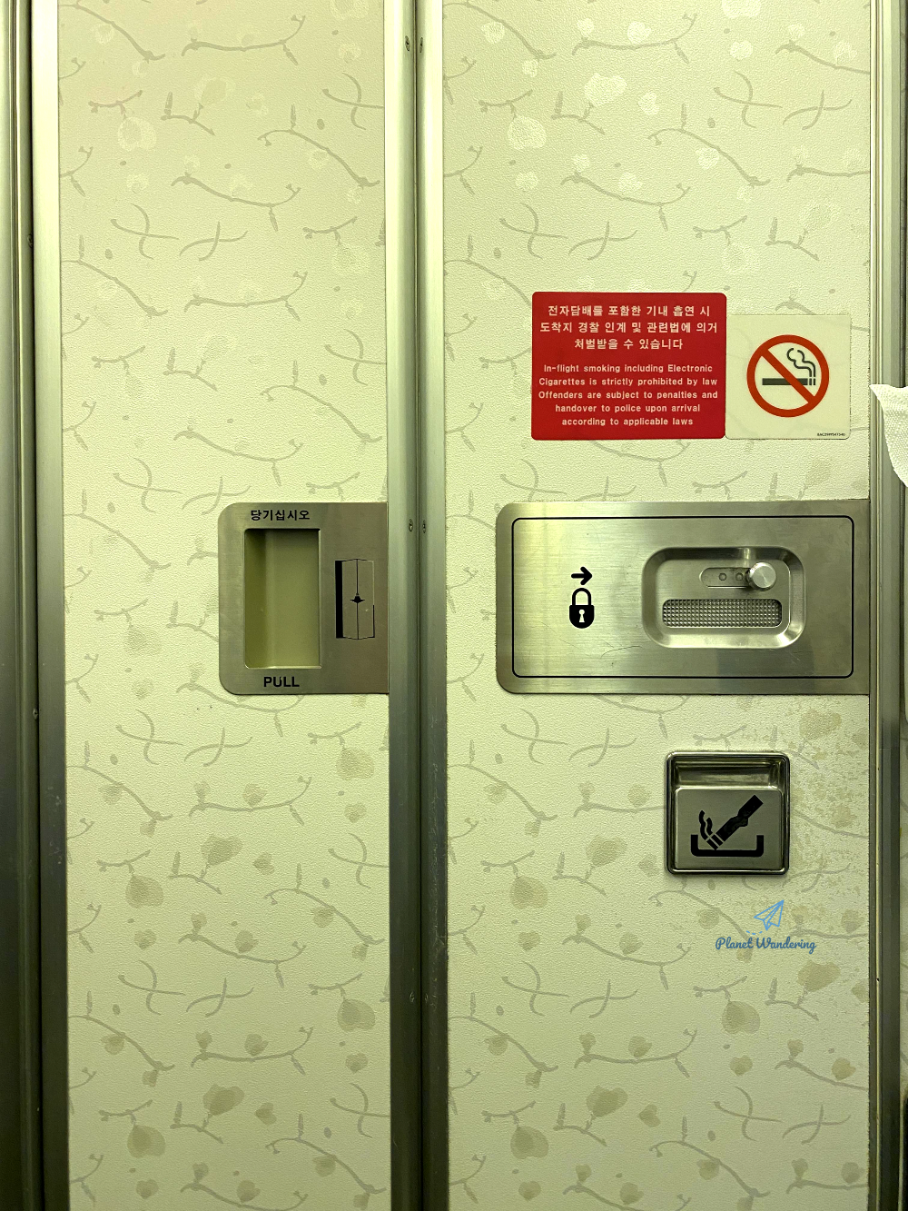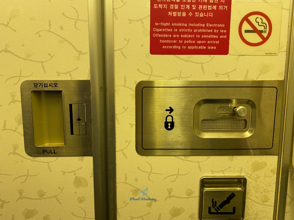 비행기 연식이 좀 된 모양입니다. 자꾸 에미레이트항공과 비교를 하게 되어 좀 그렇지만 화장실의 비품들도 조금 중저가로 느껴지네요. (에미레이트항공 비행기들도 오래되어 좀 삭았습니다만,,) 물비누와 핸드로션도 좀 부실해 보이고 수도꼭지를 실리콘으로 마무리를 해서 보수를 한 게 썩 좋아 보이지는 않습니다.