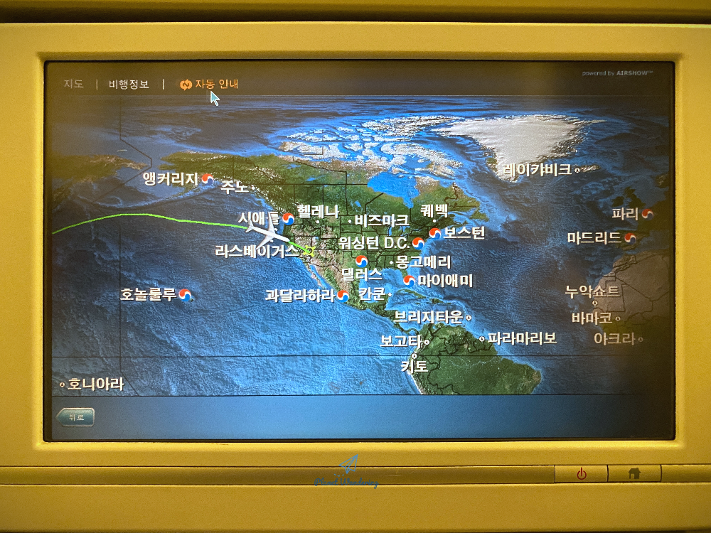 잠시 뒹굴뒹글하다 내비게이션을 켜보니, 시간이 흘러 흘러 비행의 절반 정도를 날아온 것 같습니다. 태평양 한가운데를 날아가고 있네요. 날짜 변경선을 넘어서 하루 뒤로 후퇴를 했네요. 날짜변경선은 참 재미있죠. 우리나라를 저녁 8시 30분에 출발했고 10시간을 넘게 날아갔는데 도착지인 라스베이거스는 같은 날 오후 4시 경이되니까요. 물론 돌아올 때는 거의 이틀을 손해 보지만 소중한 여행지에서 시간을 길게 쓸 수 있다는 건 좋은 점이죠.