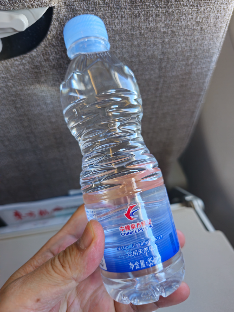 기내식이 나오면 기내 음료도 따라 나와야겠죠? 중국동방항공 부산-상하이 노선에서는 커피, 콜라 같은 익숙한 기내 음료 대신 생수를 한 병씩 나눠줍니다. 뭐 설탕 들어간 콜라보다는 생수가 건강에는 좋겠죠.