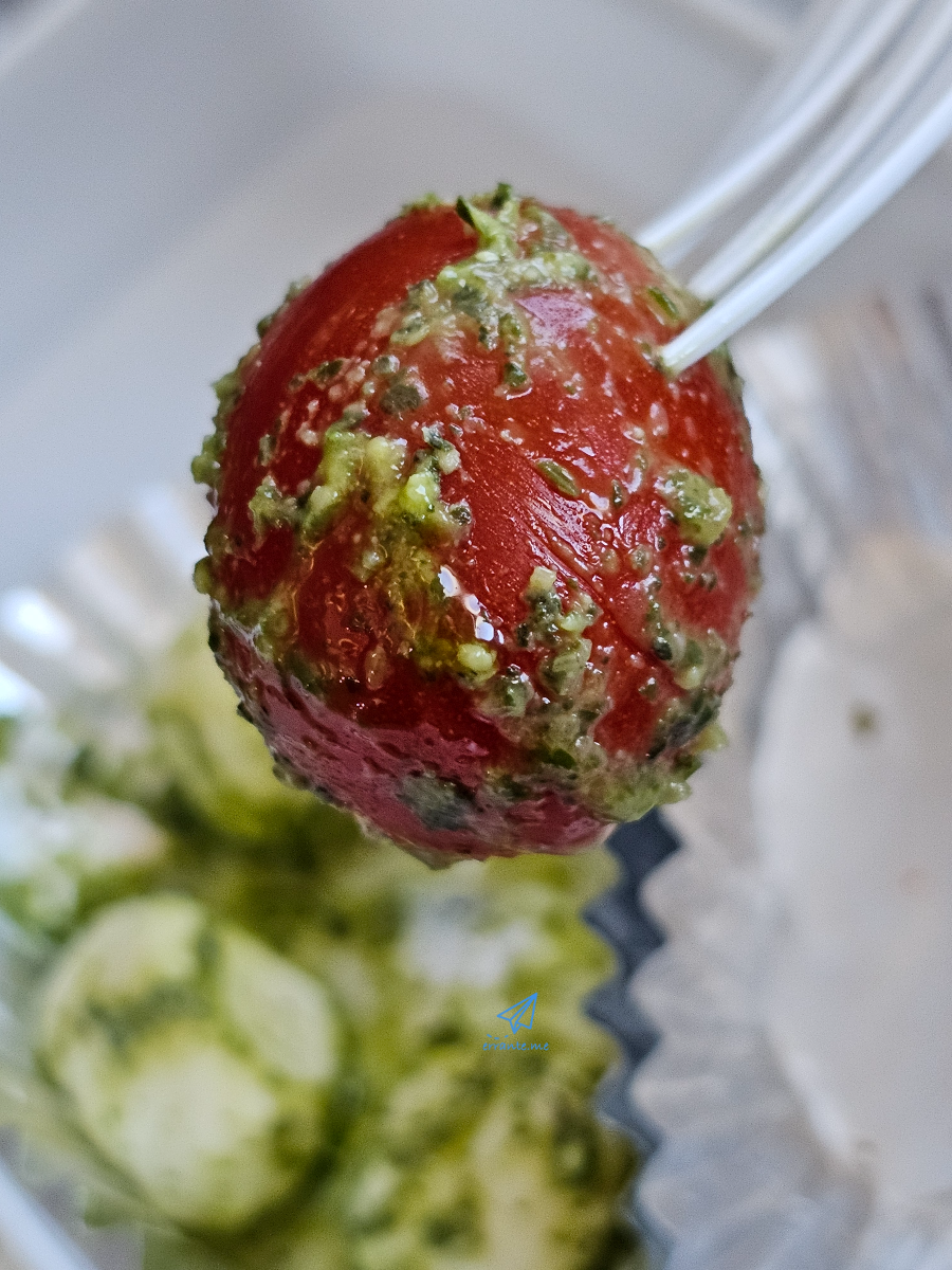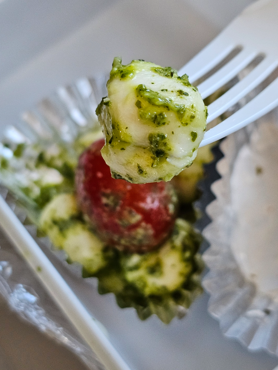 샐러드는 차갑습니다. 치즈볼과 방울토마토, 파스타와 얇게 썬 햄, 파프리카로 구성된 샐러드입니다. 파스타 자체의 맛은 괜찮았습니다. 재료들은 모두 신선하게 느껴졌고 갓 만든 것처럼 부드럽고 촉촉했죠.