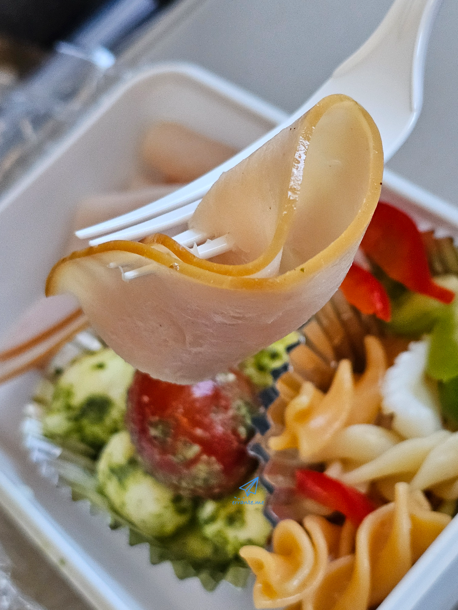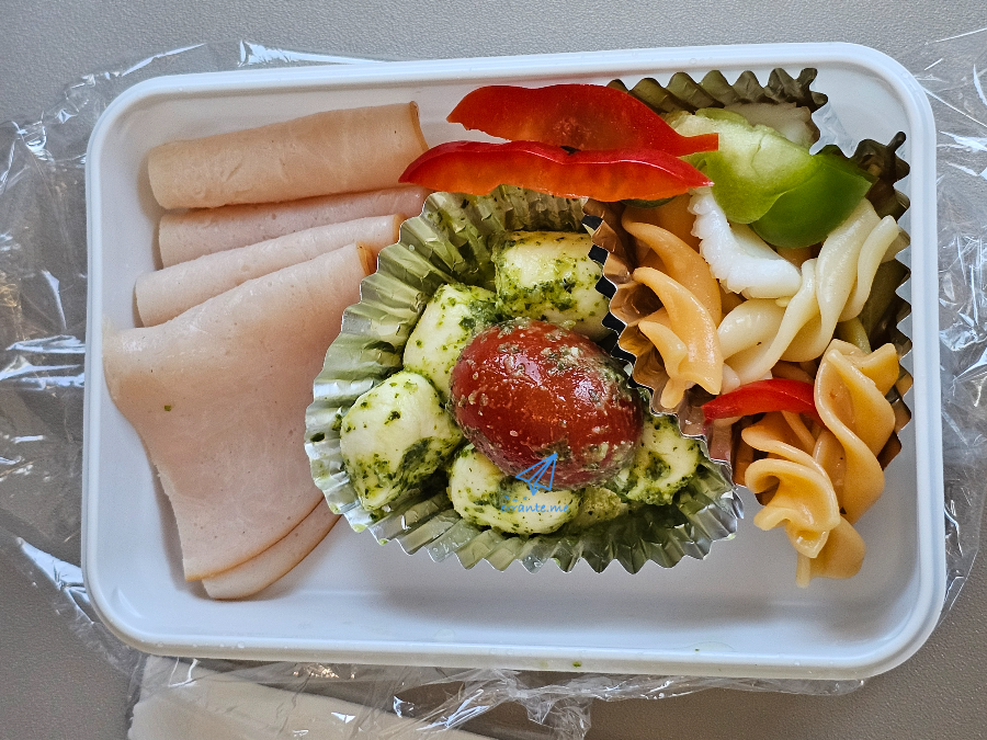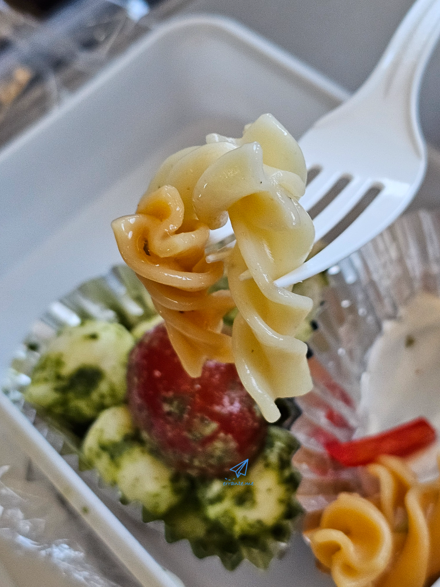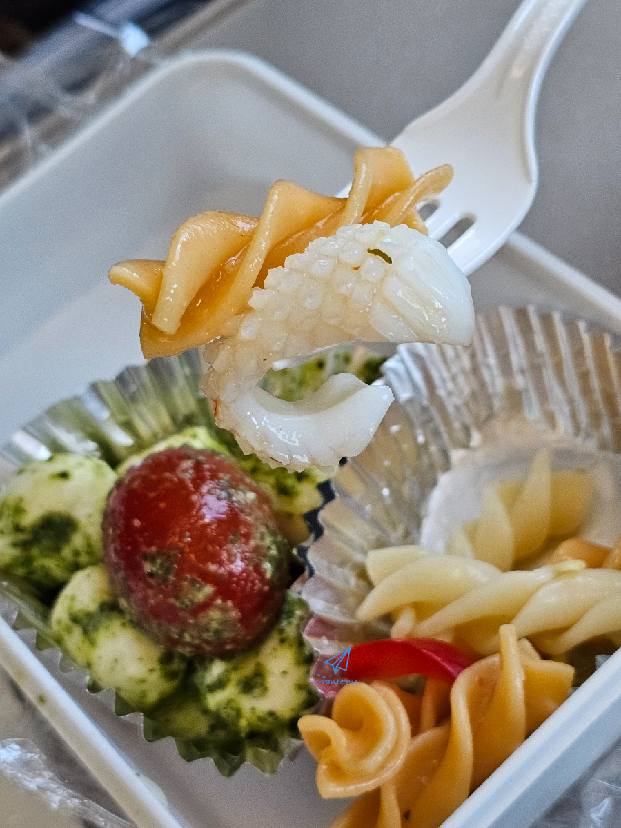 치즈볼은 탱글탱글 탄력이 좋고, 파프리카도 아삭한 게 좋았습니다. 파스타 사이로 오징어도 들어있는게, 기내식 이름을 치즈볼 해물 샐러드(?) 정도로 붙이면 되지 않을까 싶었습니다.
