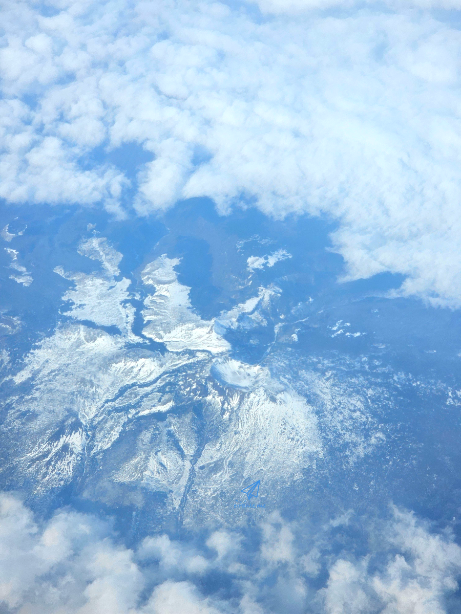 바다를 건너고 있구나 싶던 중, 창 아래로 독특한 풍경이 나타났습니다. 순간 직감적으로 한라산이구나 생각이 들었죠. 신기하게도 한라산 정상 부근만 구름이 없이 맑은 모습이었고 운 좋게 한라산 위를 지나는 타이밍을 맞출 수 있었습니다.
