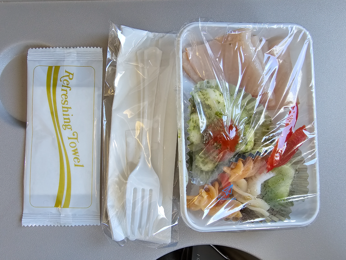 플라스틱 용기에 담긴 샐러드, 플라스틱 포크와 스푼 나이프, 그리고 물티슈가 들어있습니다. 10년 전, 치킨? 비프?를 물어보던 풀 세팅 기내식은 이제 부산 상하이 노선에서는 완전히 사라진 모양입니다.