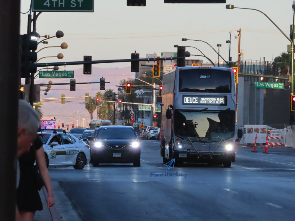 남쪽으로는 1950년대 라스베가스 웰컴 사이니지로부터 시작해 스트립의 화려한 호텔과 상점들을 지나 북쪽 끝으로는 1900년대 라스베가스가 처음 시작된 다운타운과 프리몬트스트리트 익스피리언스까지를 연결하는 듀스 버스는 24시간 운행을 하기 때문에 이른 시각에도 늦은 때에도 관광객을 라스베가스 구석구석까지 실어 날라줍니다.
