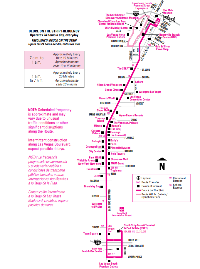 시내버스 이름입니다. 번호 대신 듀스라는 이름이 붙어있죠. 이 버스가 유명한 이유는 라스베이거스의 핵심 지역이라 할 수 있는 스트립 전체가 노선에 포함되어 있고 북쪽 종점이 라스베가스 다운타운의 핫 플레이스인 프리몬트 스트리트 익스피리언스이기 때문입니다.