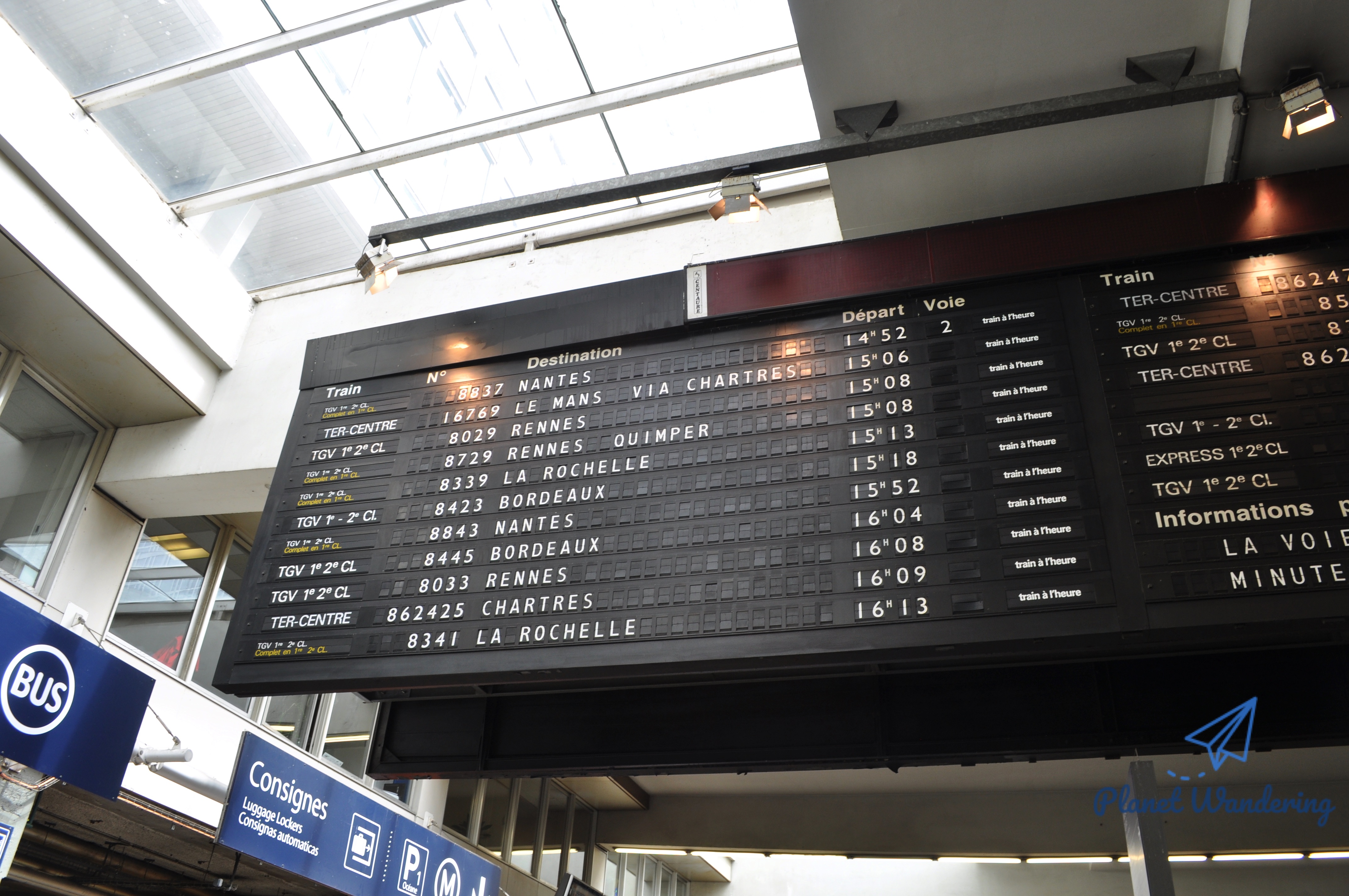 전광판에 출발하는 기차들이 가득 차 있습니다. 낭트, 보르도, 라 로셸 같은 프랑스 도시 이름들이 보이네요.