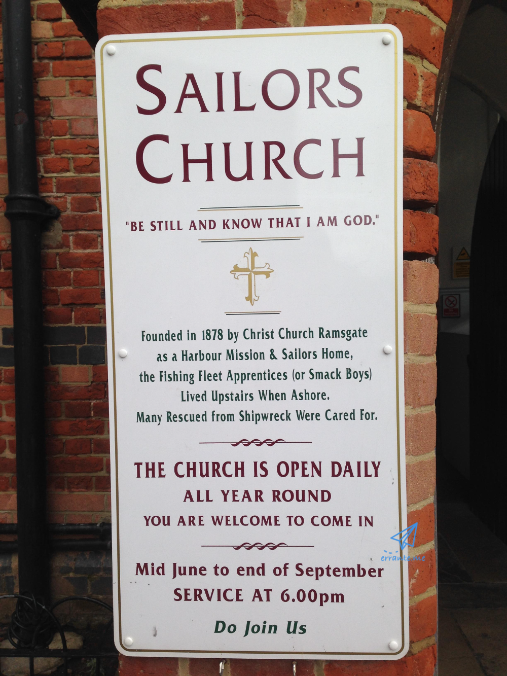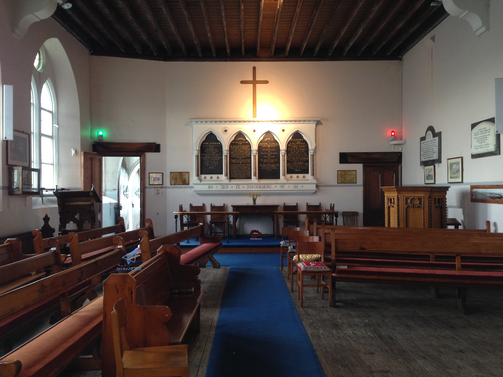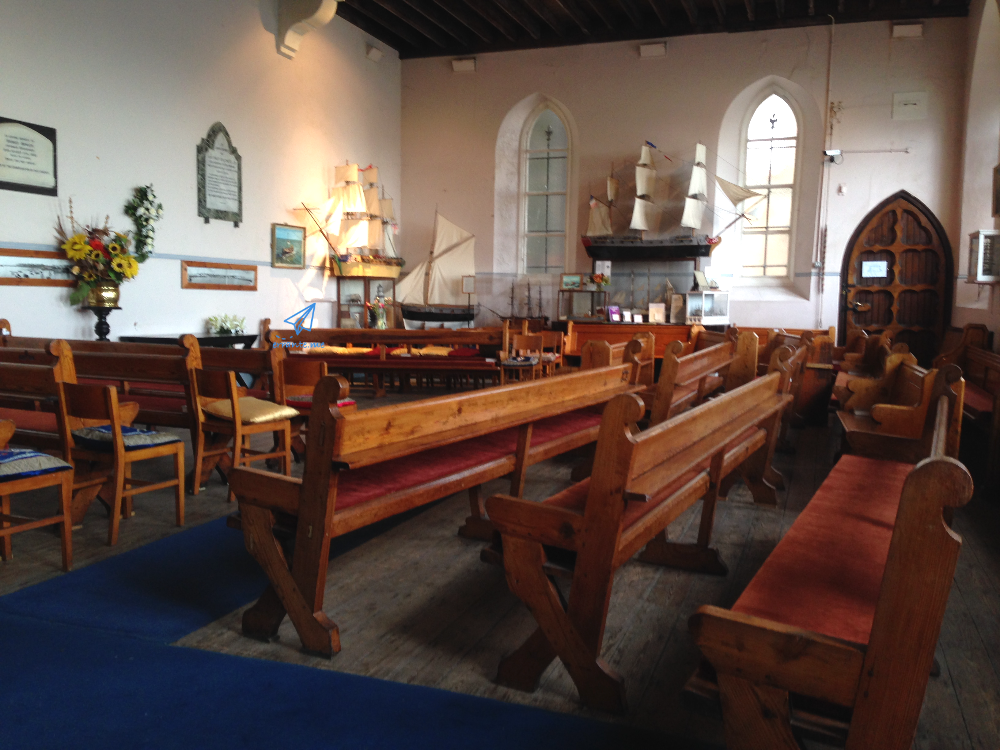 교회 입구는 서쪽으로 나 있고 늘 개방되어 있어 관광객도 출입이 가능합니다. 예배나 행사가 없는 날의 교회 안은 조용하고 소박한 분위기입니다. 램즈게이트 관광지를 안내하는 사이트들은 바닥에 깔린 파란 카페트는 바다를 상징하며 성스러운 공간이지만 보통의 교회와 달리 선원들의 일과 관련 있는 배의 모형, 그림 등 세속적인 장식품들이 많이 있다고 묘사하고 있습니다.