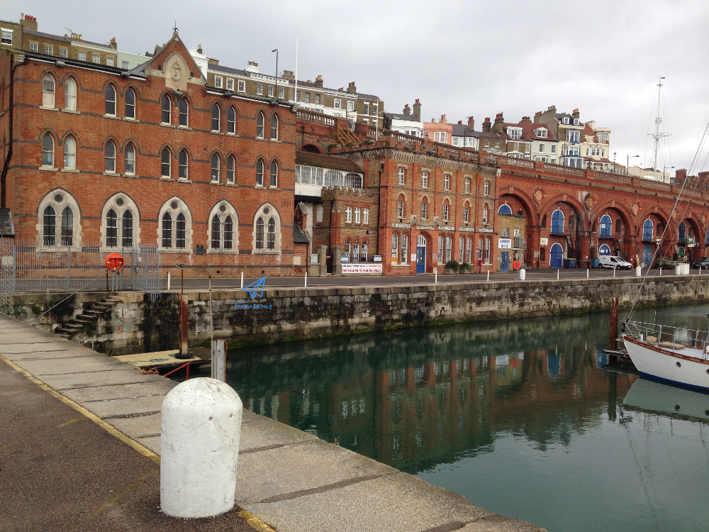 램즈게이트 항구 주변은 특이한 모양새를 하고 있습니다. 바다에서 바라보면 서쪽에서 동쪽으로 거대한 경사가 진 석회암 절벽입니다. 이 절벽을 따라 이어진 붉은 벽돌 건축물은 1890년대 만들어졌는데 항구 앞 도로인 밀리터리 로드, 한 층 위 도로인 로열 퍼레이드 로도, 맨 윗층의 넬슨 크레센트 로드까지 3개 층의 길을 만드는 도시 계획의 일부로 건축되었습니다.