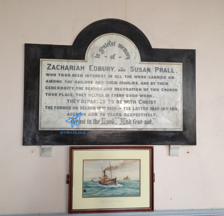 정면 십자가 아래로는 주기도문과 십계명이 새겨져 있고 오른편으로는 램즈게이트 선원교회를 후원했던 애드버리 Edbury 와 프럴 Prall 에 대한 기념 부조가 걸려 있습니다. 기념 부조 밑으로도 파도를 가르며 연기를 내뿜는 배의 그림이 놓여 있습니다. 과거 항해기술이 좋지 않았던 시기, 항해하는 선원들의 안전을 기원했던 당시의 분위기를 느낄 수 있습니다.