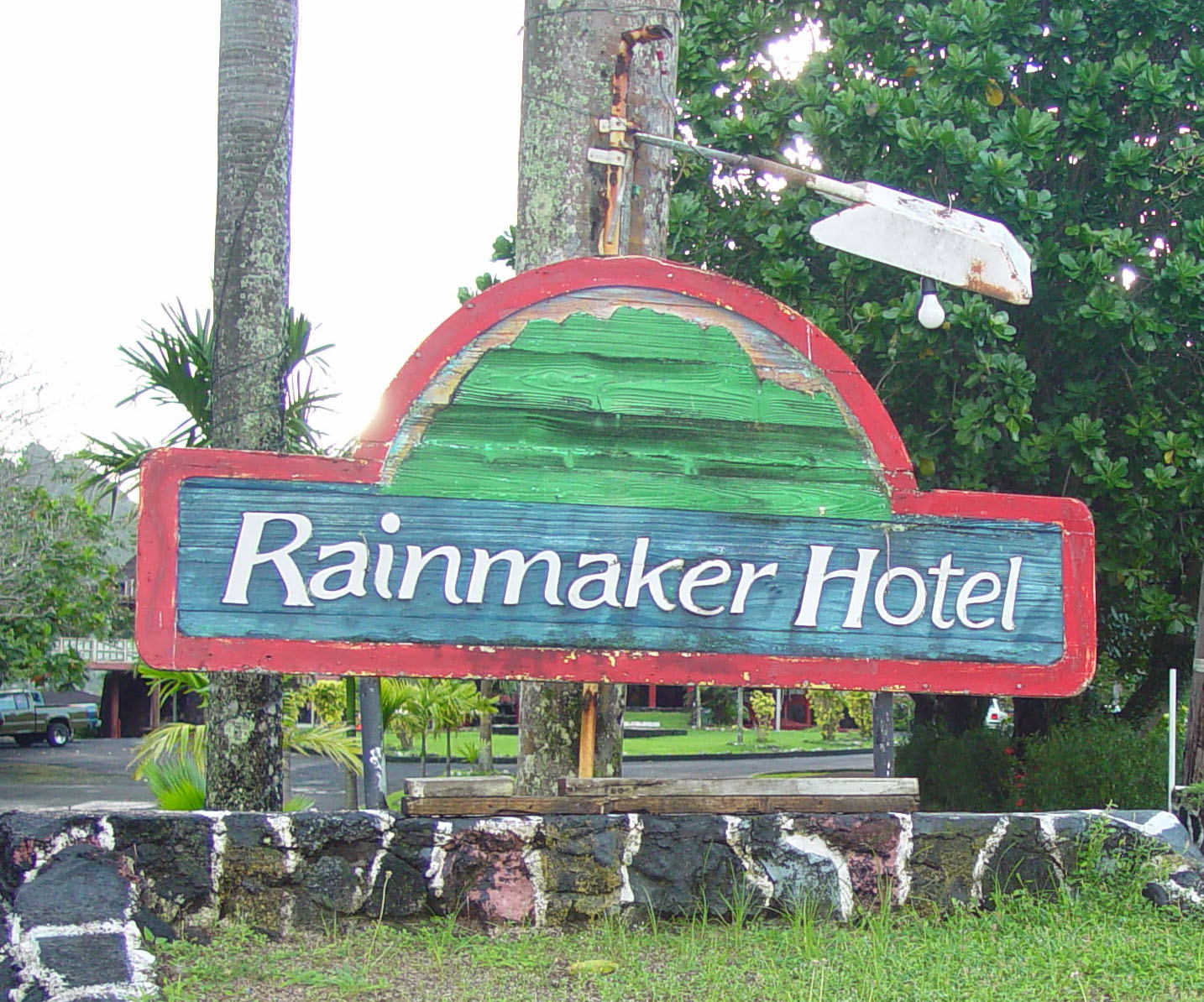 호텔 입구에 세워진 레인메이커 호텔 간판입니다. 칠이 벗겨진 나무판과 알맹이가 튀어나온 백열전구의 모습도 당시에는 인상적으로 느껴졌습니다.