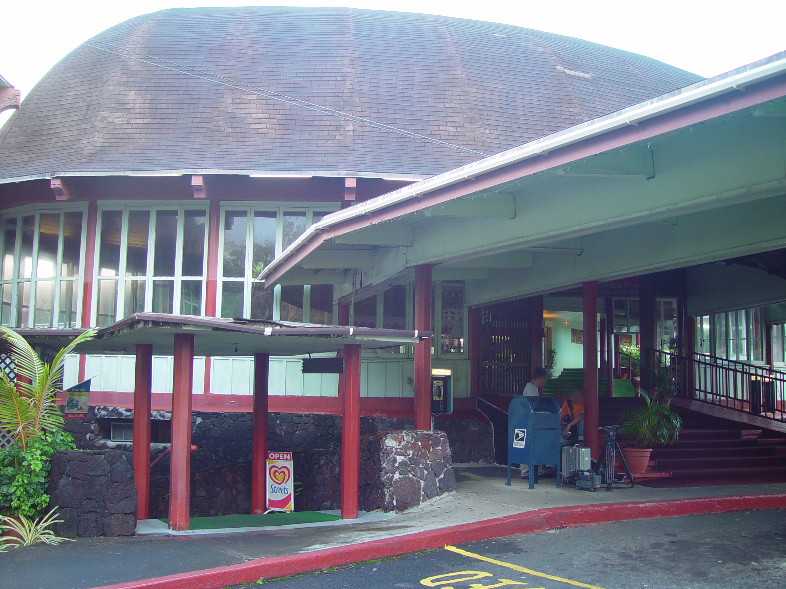 로비 왼쪽의 유리창 공간은 호텔 레스토랑입니다. 창가나 뒤편 테라스에 나가 앉으면 팡고팡고만의 바다를 감상할 수 있었습니다. 정문 옆으로 미국 우편서비스의 우체통이 있고 그 뒤로 미국 공중전화기가 있습니다. 공중전화기는 미국 달러 동전을 넣고 사용했습니다. 아이스크림 로고가 그려진 입간판을 따라 내려가면 옷과 잡화류를 파는 작은 매장이 있습니다.
