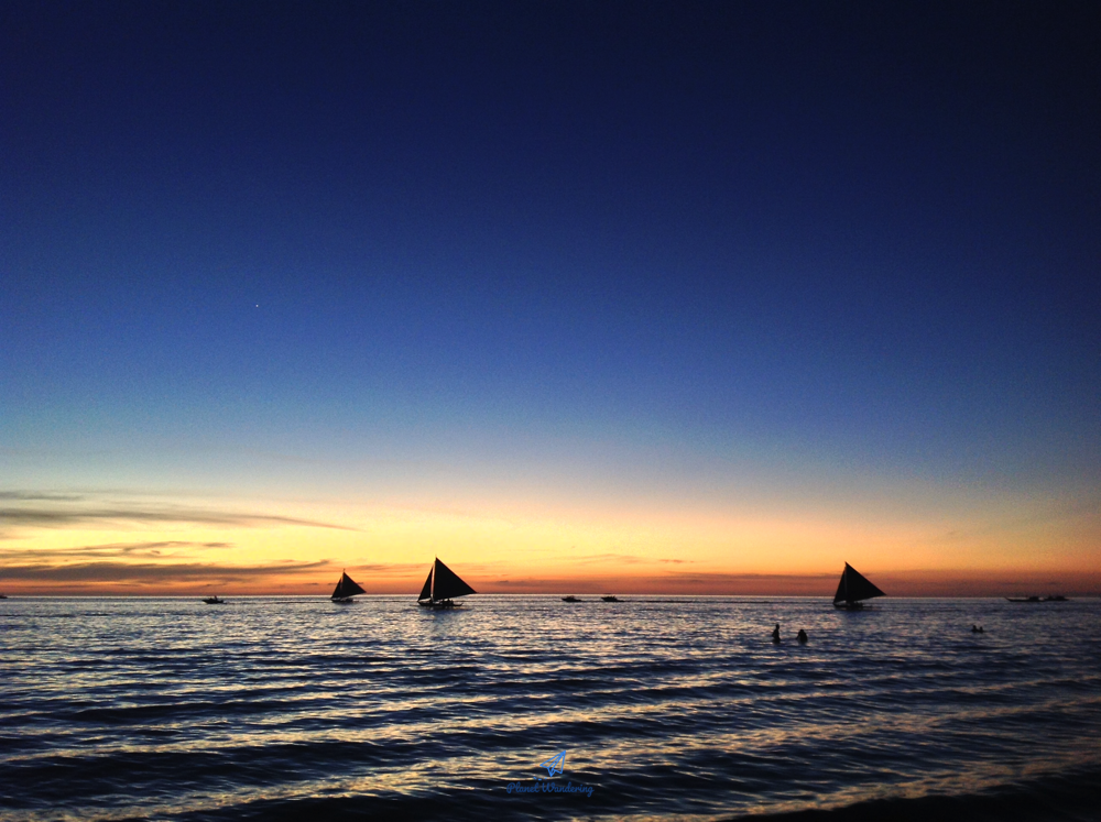 그래서 낭만적인 일몰 감상은 바다 위 보다는, 화이트비치 모래 위가 더 평온하겠죠. 보라카이 일몰의 장관은 해가 지고, 어둠이 황혼을 완전히 덮을 때까지 이어집니다. 수평선 위로 점점이 박힌 삼각 돛단배가 더 매력적인 분위기를 만들어줍니다. 물론 배 위에 타고 있는 분들은 낭만보다는 와일드 세일링을 경험하고 있겠죠. 바람을 타면 제법 속도도 빠르거든요.