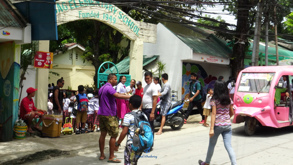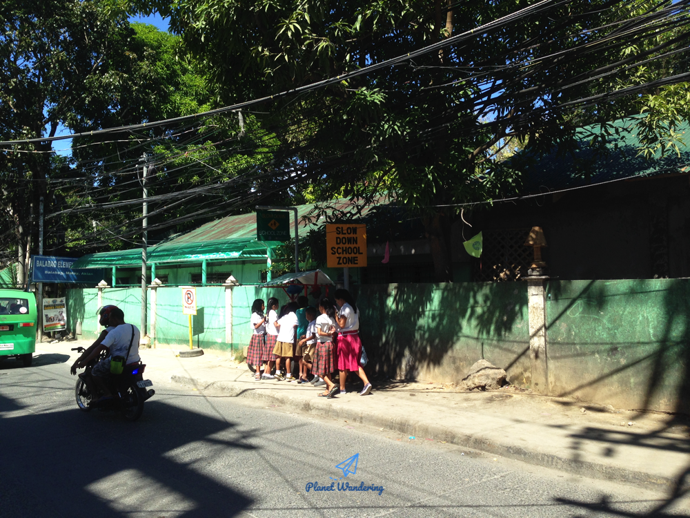 보라카이 메인도로에 있는 학교 앞, 스쿨존이 설정되어 있습니다. 하교 시간이 되자 학교 앞이 복잡해집니다.
