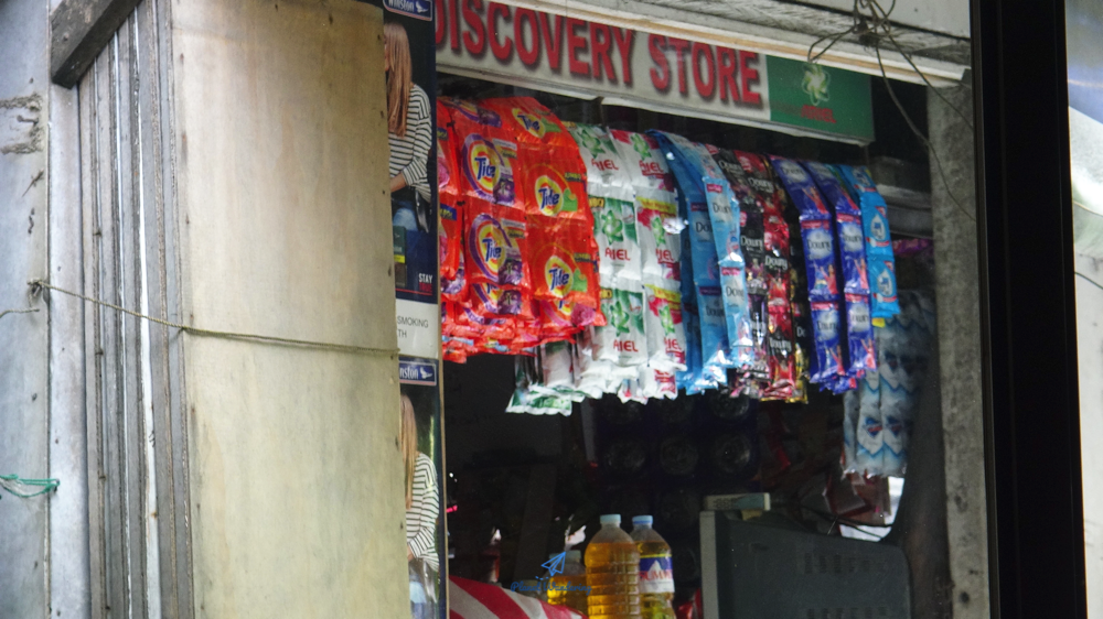 주로 세탁 가루비누,샴푸, 치약 같은 것들이 옛날 줄줄이 사탕처럼 길게 매달려있죠. 이런 모습은 개발도상국 상점에서 쉽게 볼 수 있는 모습들입니다. 우리나라 대형마트에서 파는 물건들처럼 큰 통에 들어있는 대용량 제품을 구매할 여력이 없기 때문에 필요할 때마다 조금씩 사 쓰는 소비형태가 일반화되어 있기 때문입니다. 여행자들을 위해 작은 포장으로 만들어 파는 것이 아닌 거죠.