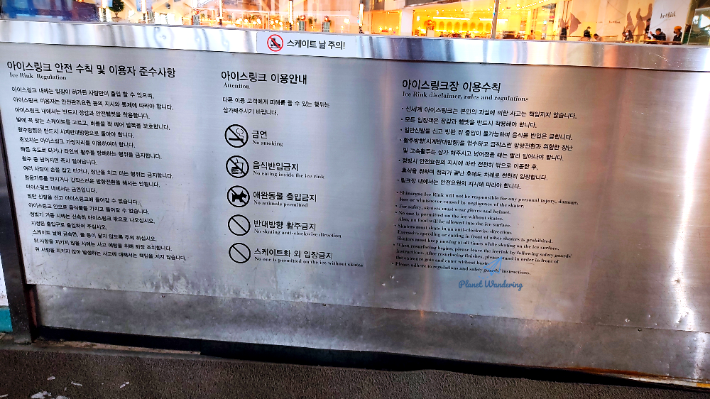 신세계 아이스링크의 또 다른 장점으로는 안전요원을 들 수 있습니다. 여러 명의 안전요원이 링크를 계속 돌면서 안전상황을 체크합니다. 혹시나 서로 충돌하여 넘어지는 상황을 보게 되면 넘어진 손님들에게 모두 괜찮은지를 확인하죠. 이용수칙에 보면 사고를 유발한 사람에게 책임이 있다고 되어 있기 때문에 늘 조심해서 타야 합니다.