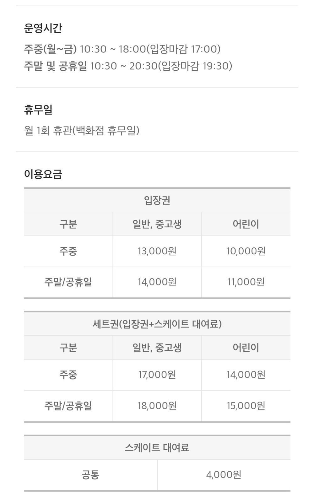 주말 : 어른과 중고생 - 입장료 14,000원 + 스케이트 대여료 4,000원