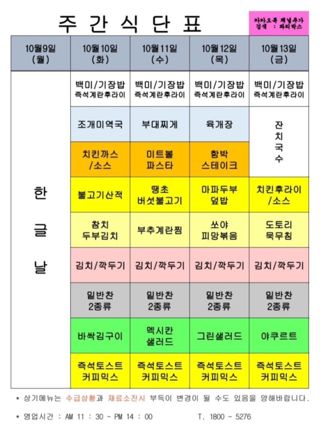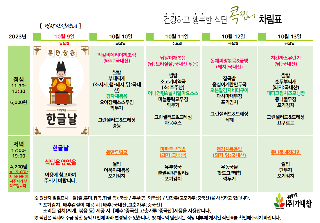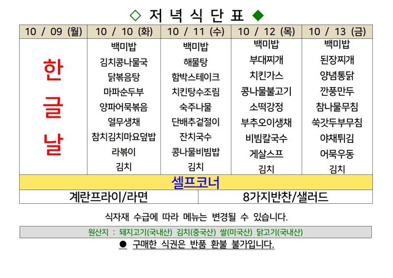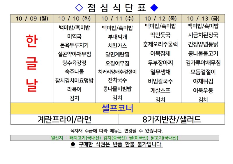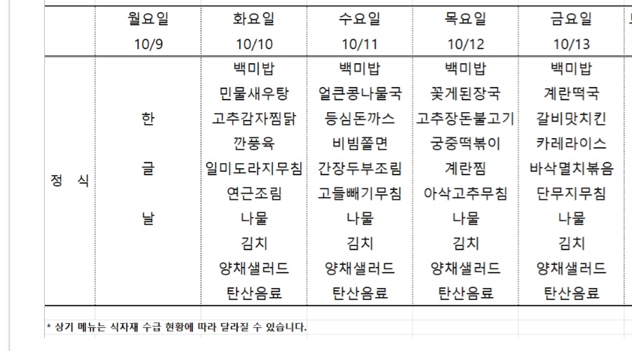 센텀시티 구내식당 식단표 [10월 10일 - 10월 13일] 주간