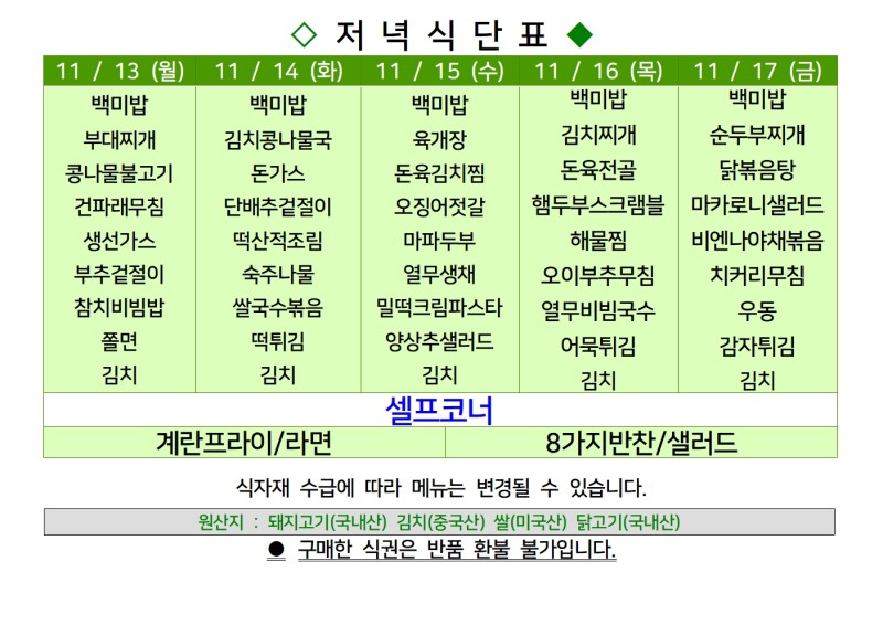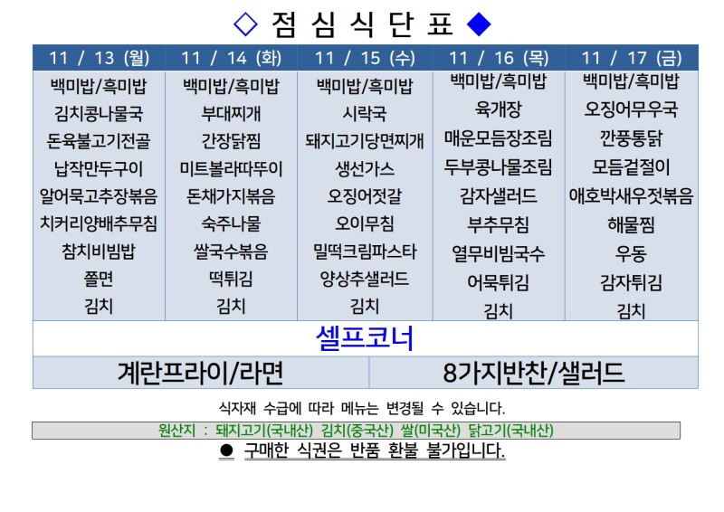 센텀시티 구내식당 식단표 [11월 13일 - 11월 17일] 주간