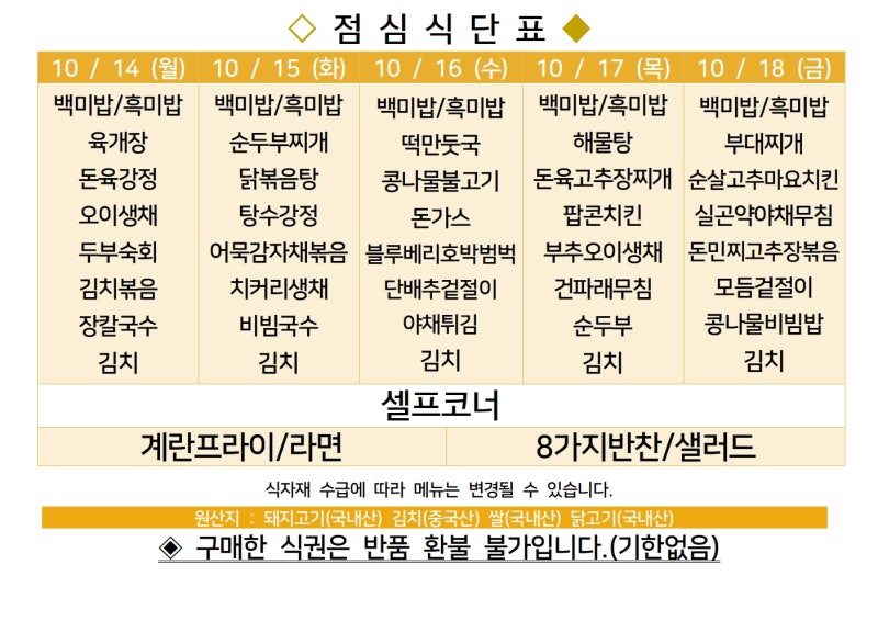 센텀시티 구내식당 식단표 2024년 [10월 14일 - 10월 18일] 주간