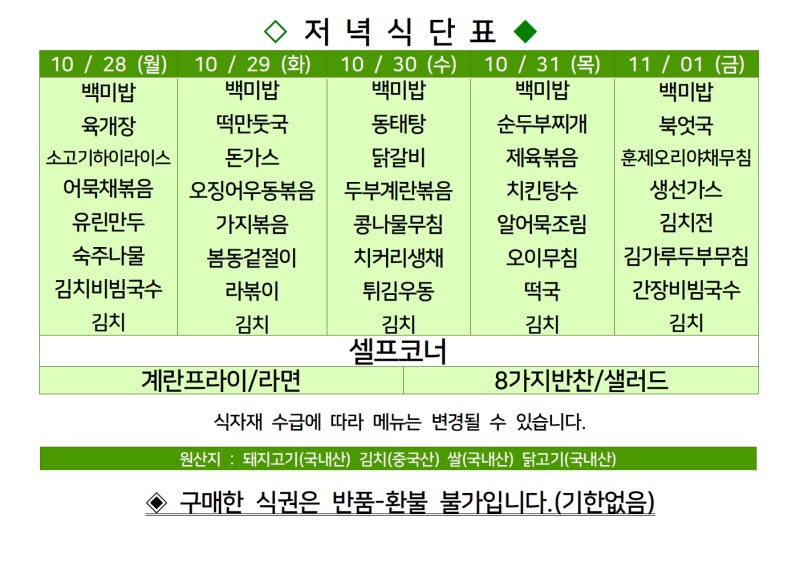센텀시티 구내식당 식단표 2024년 [10월 28일 - 11월 1일] 주간
