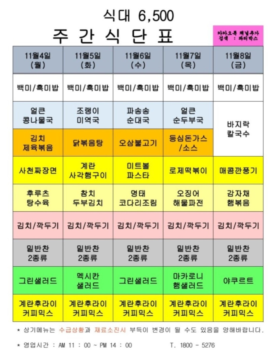센텀시티 구내식당 식단표 2024년 [11월 4일 - 11월 8일] 주간