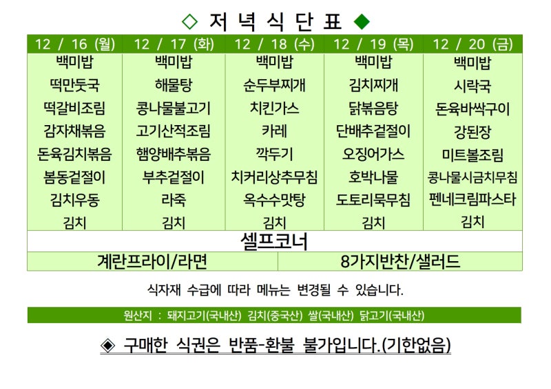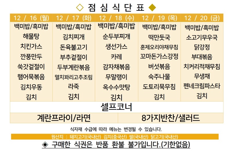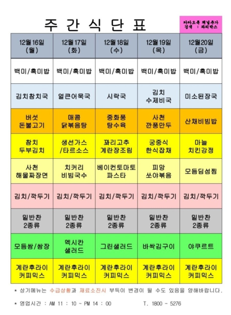 센텀시티 구내식당 식단표 2024년 [12월 16일 - 12월 20일] 주간