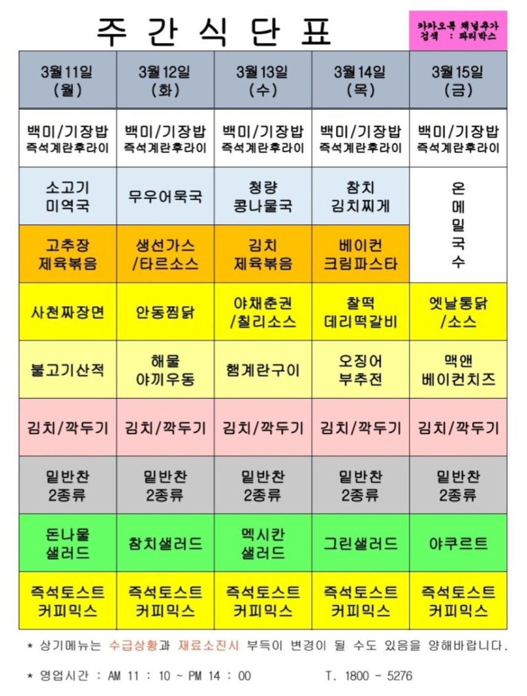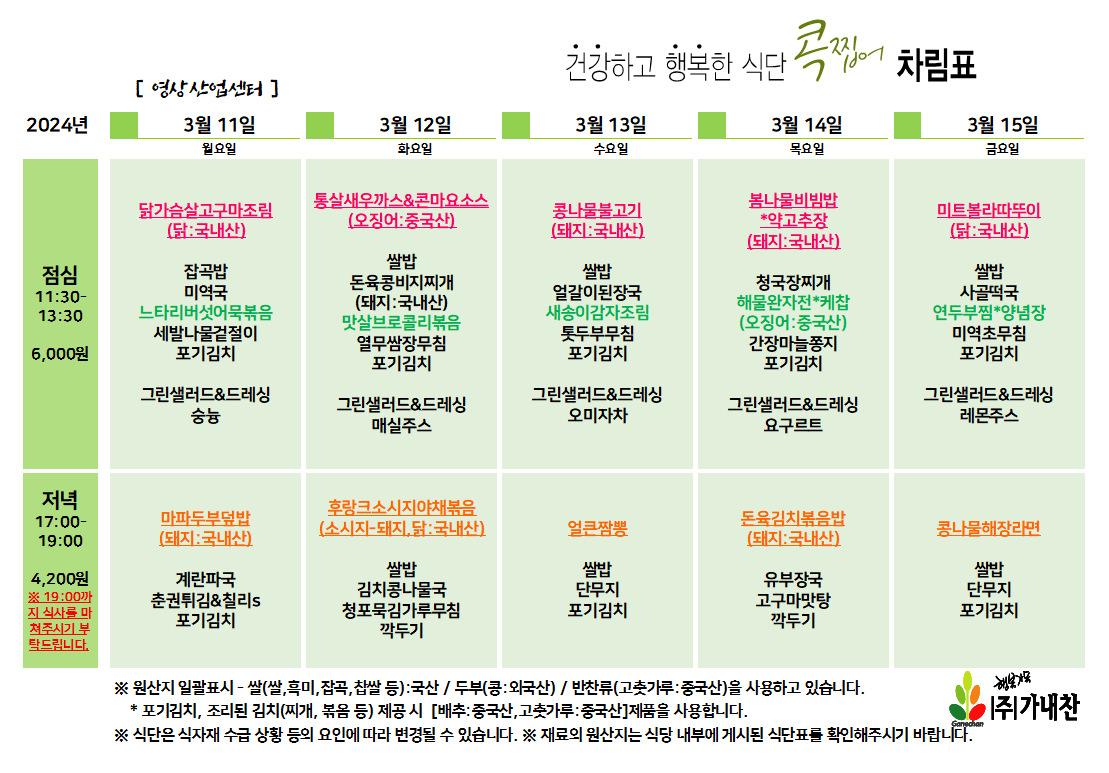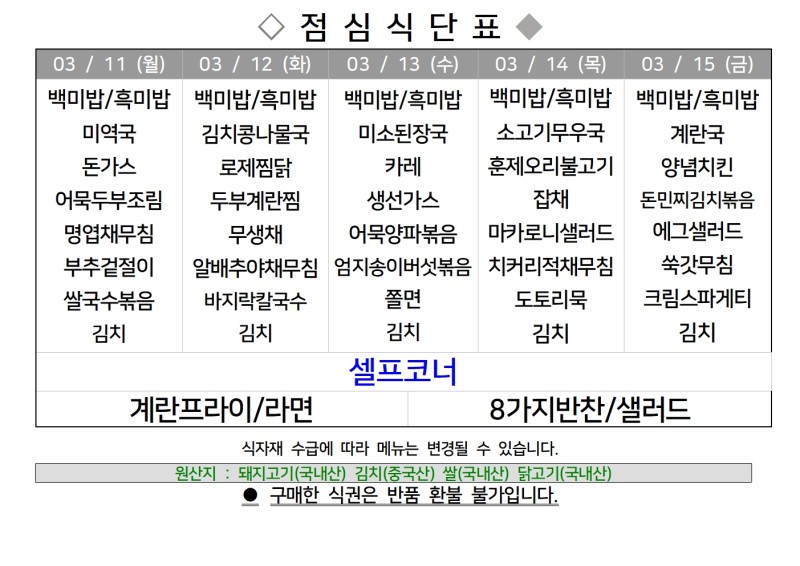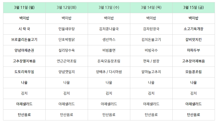 센텀시티 구내식당 식단표 2024년 [3월 11일 - 3월 15일] 주간