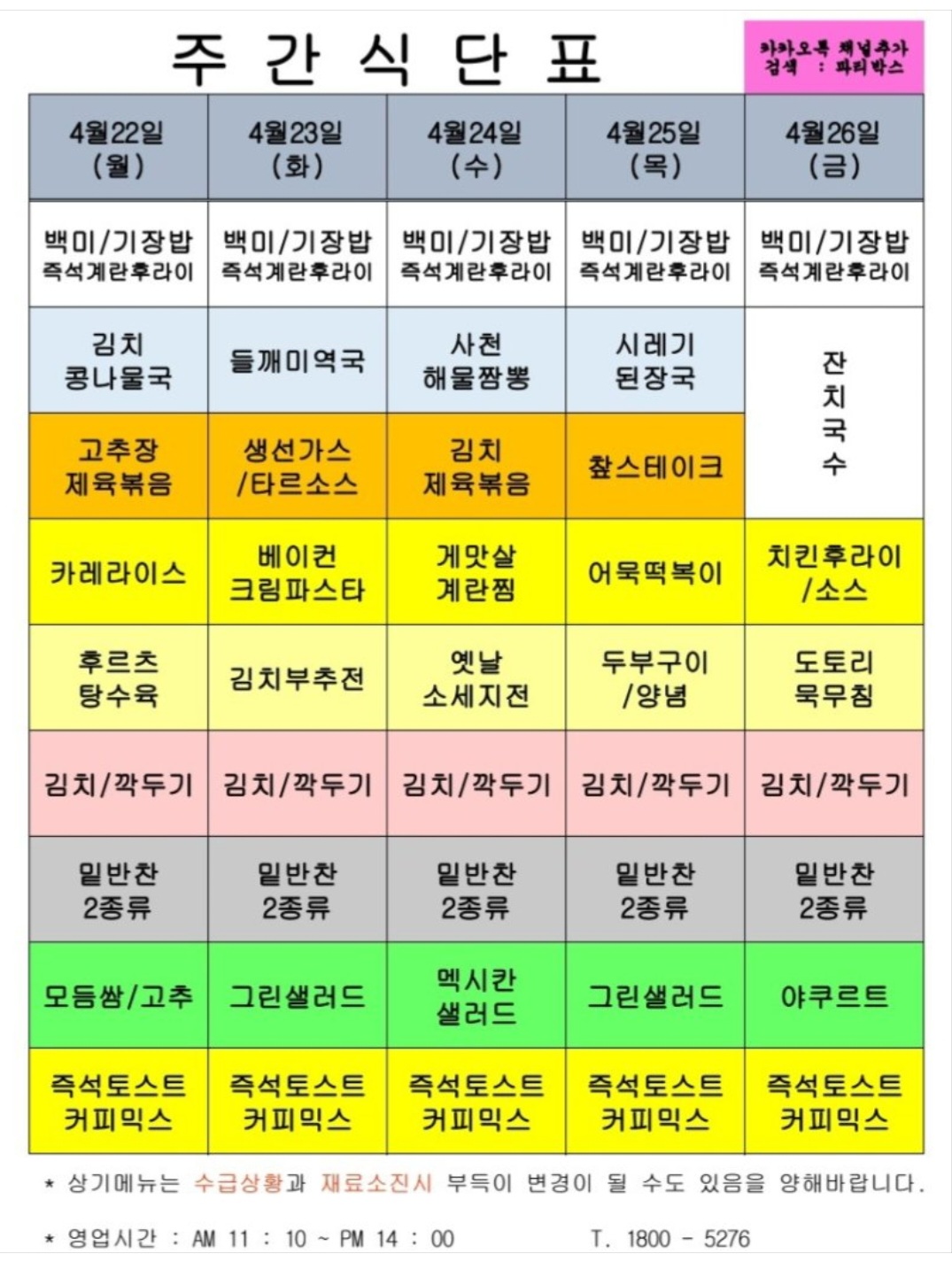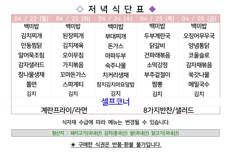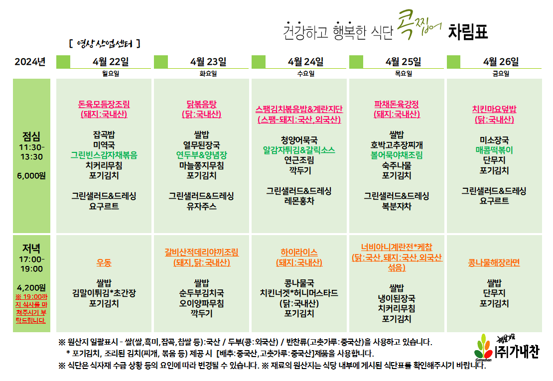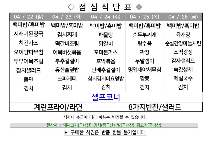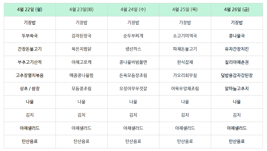 센텀시티 구내식당 식단표 2024년 [4월 22일 - 4월 26일] 주간