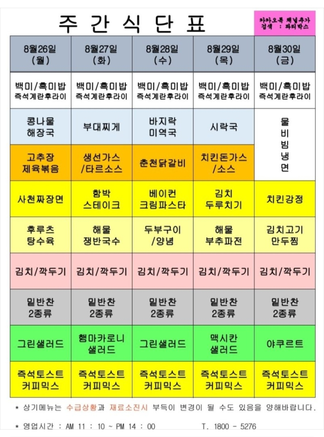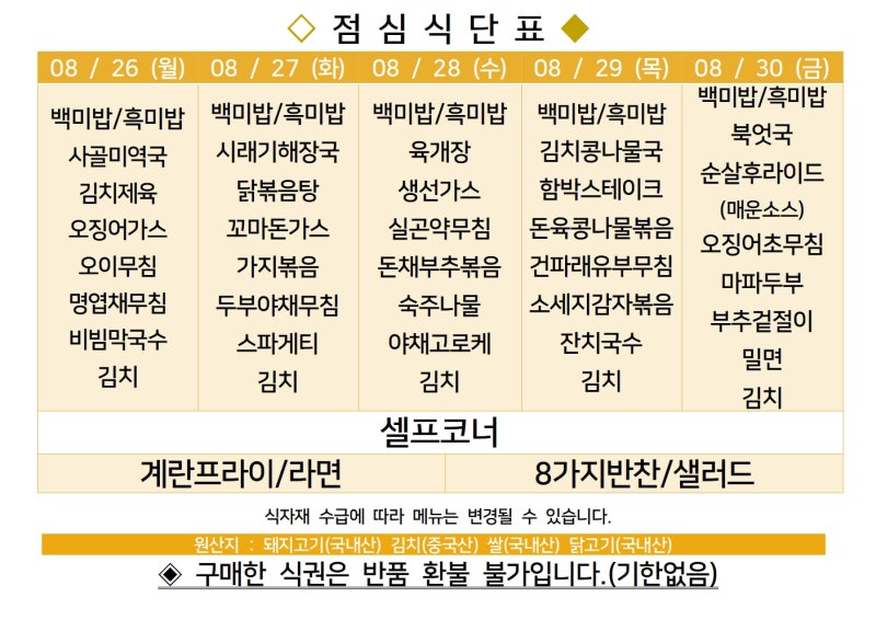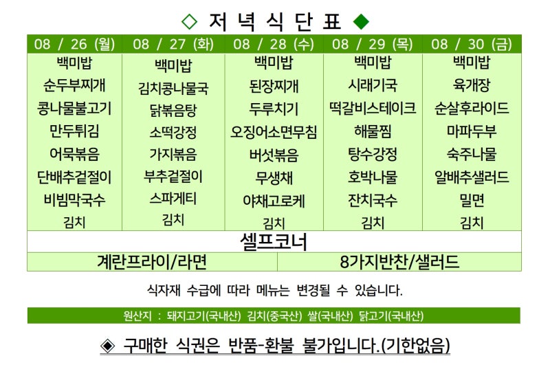 센텀시티 구내식당 식단표 2024년 [8월 26일 - 8월 30일] 주간